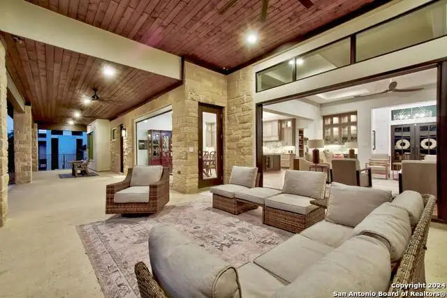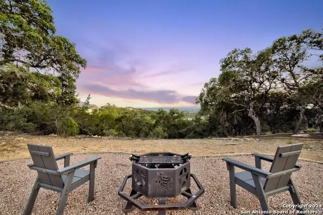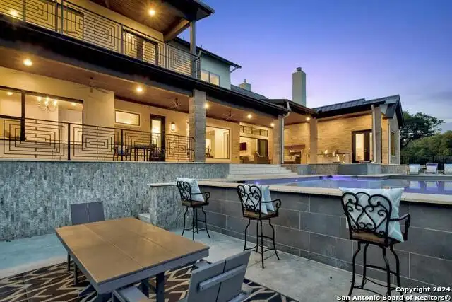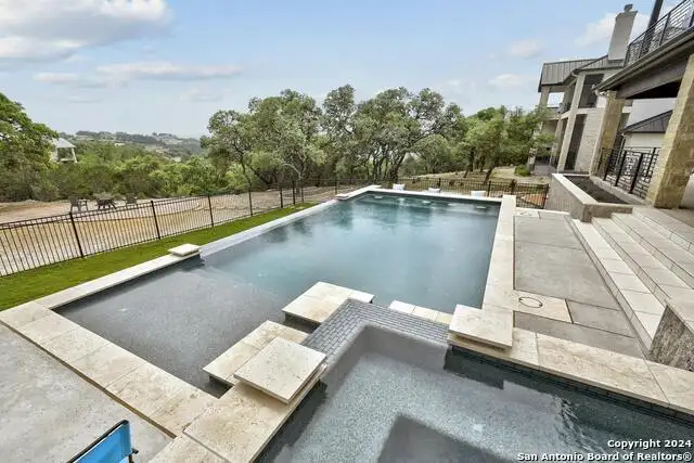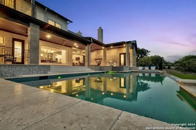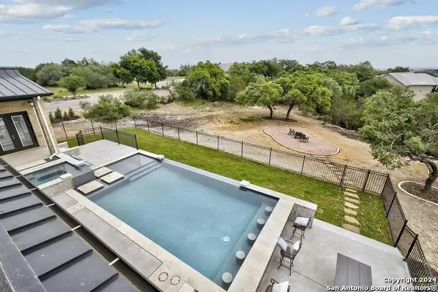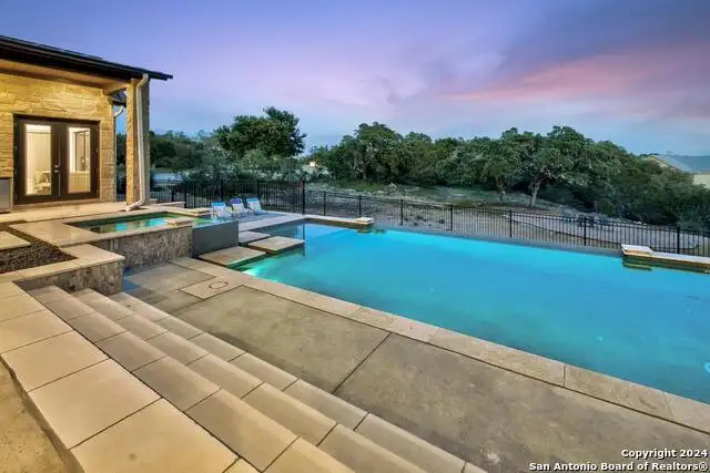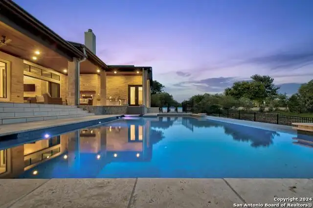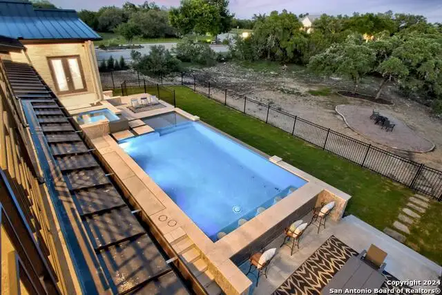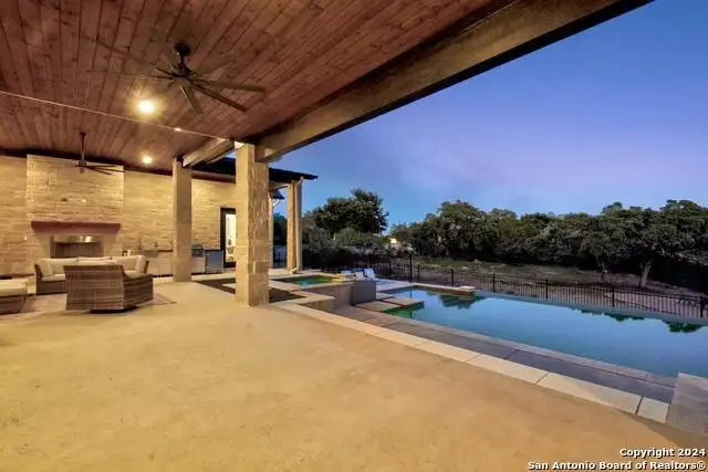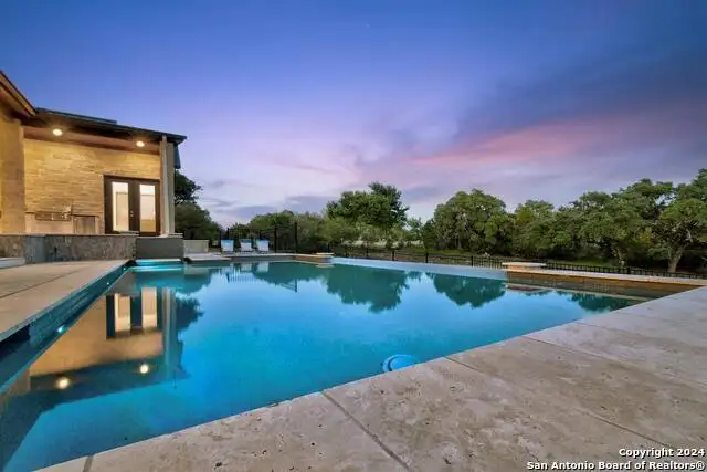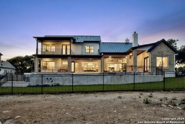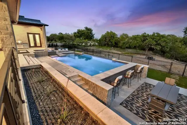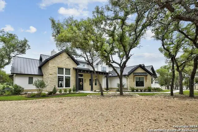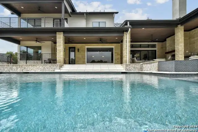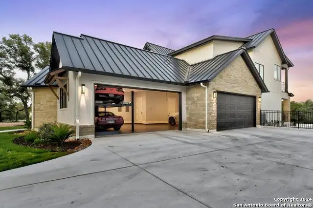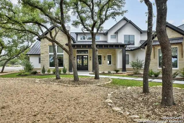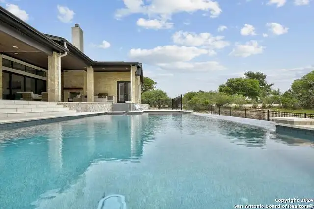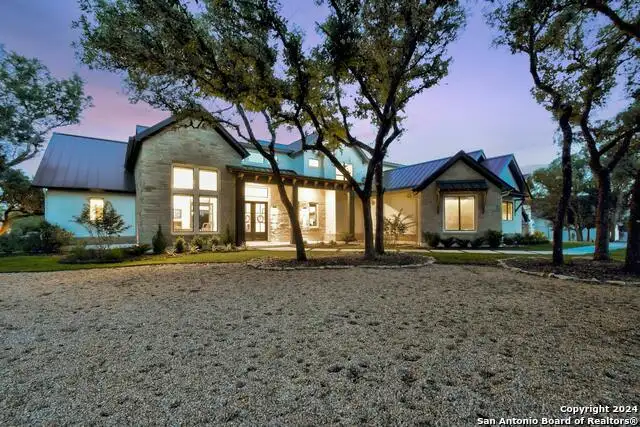 Nestled within the serene embrace of Mystic Shores in Spring Branch, Texas, awaits a modern Texas Hill Country masterpiece, a sanctuary of luxury and elegance. Welcome to a residence where every detail speaks of refined taste and meticulous craftsmanship, offering a lifestyle of unparalleled comfort and sophistication. Featuring 4415 square feet, 4 bedrooms, 3 full bath, 2 half bath, and an air conditioned 4 car garage with epoxy flooring that comes with a car lift (this is for the most discerning car aficionado). As you approach this stunning home, its grandeur is evident from the outset. An impressive facade beckons you to step through 8-foot double iron & glass doors, into a realm of timeless beauty and contemporary allure. This residence epitomizes spaciousness and grace. Upon entering, you're greeted by an expansive open-concept design, where natural light dances through windows that span the rear of the home. The ambiance is warm and inviting, anchored by wide plank solid hardwood floors that exude understated luxury. Directly to the left, a spacious study awaits, featuring double iron glass doors, soaring cathedral beamed ceiling, and wall-to-wall solid wood black built-ins adding a touch of sophistication, creating the perfect environment for productivity and inspiration. The heart of the home lies in the chef's kitchen, where culinary dreams come to life. Custom wood cabinetry reaches to the ceiling, complemented by rare luxury Ijen Blue Quartzite counters and an Italian- imported Bertazonni appliance package. A dual fuel range with a steam oven and warming drawer, along with two dishwashers and an oversized Thermador refrigerator, ensure that every meal is prepared with precision and style. For added convenience, a secondary caterer's kitchen provides extra storage, workspace, and contemporary floating shelves. Adjacent to the kitchen, a dual refrigerator wine bar awaits, inviting you to indulge in the finer things in life. The spacious dining area offers breathtaking views of the backyard oasis, seamlessly blending indoor and outdoor living. The primary retreat is a haven of tranquility, featuring a lovely sitting area and an exquisitely finished spa bath with double vanities, a huge walk-in shower, and a luxurious soaker tub. Perhaps the crowning jewel is the nearly 200 square foot primary closet, boasting wall-to-wall built-ins and island storage for the ultimate in organization and style. A guest suite completes the downstairs layout, offering privacy and comfort for visiting guests. Upstairs, a world of entertainment awaits, with a game room featuring a full wet bar and custom cabinetry. Backlit Blue Agate counters add a touch of glamour, while the adjacent media room provides a truly immersive movie experience with a Atmos theater package. Two additional guest rooms, each with private vanities and a shared bath area, offer ample space for loved ones to relax and unwind. Outside, a breathtaking panorama awaits, with views of the majestic Hill Country, the sparkling waters of the Guadalupe River, and a beautifully designed fenced in pool/heated spa, and expansive outdoor living space. This home is a masterpiece, designed for the homeowner looking for exquisite finishes. Experience the epitome of luxury living in the heart of Texas Hill Country.