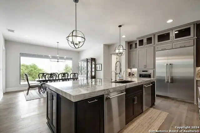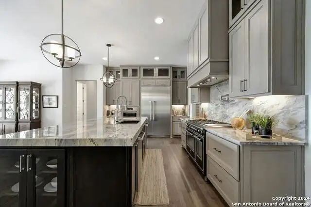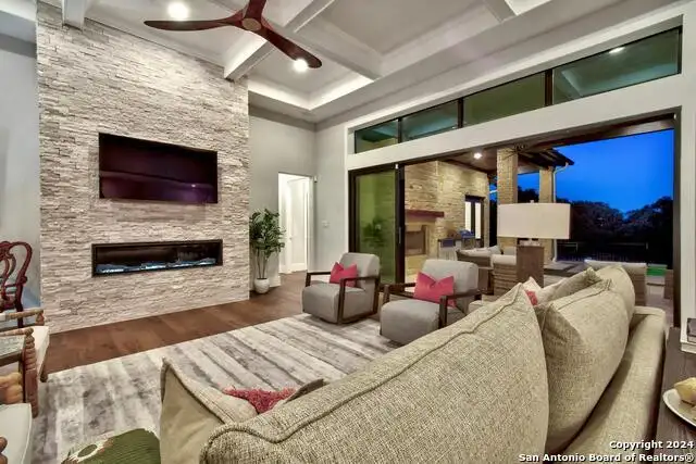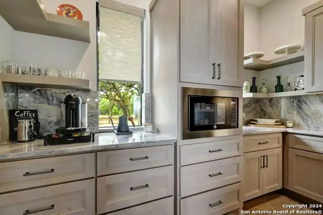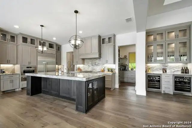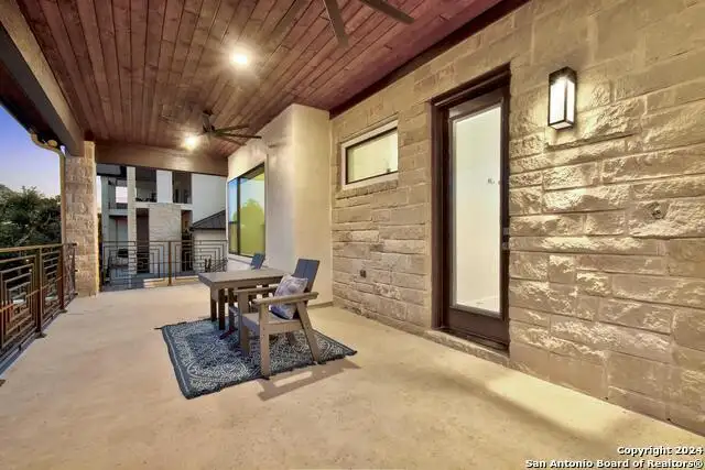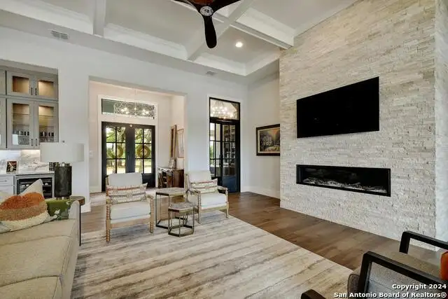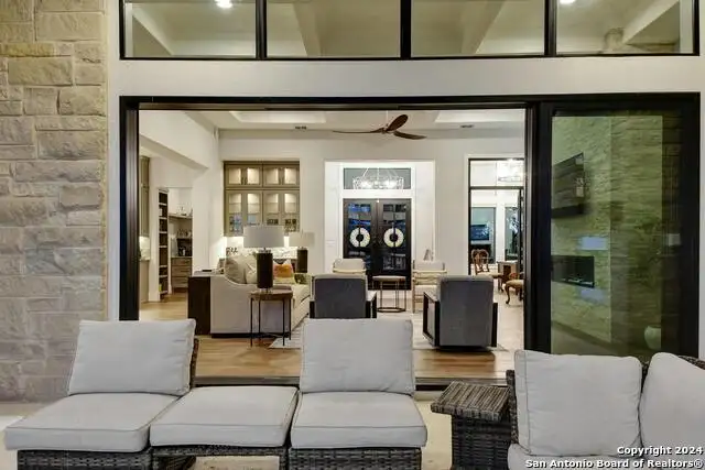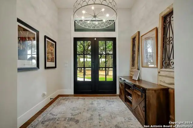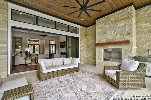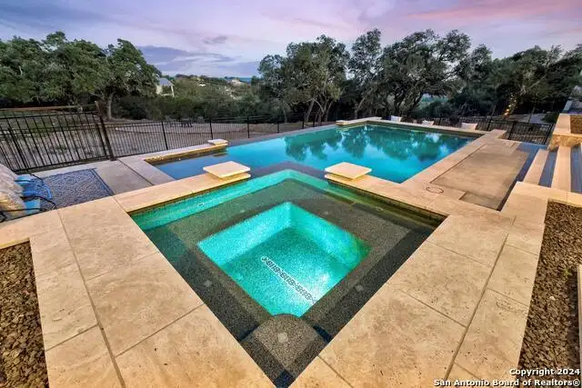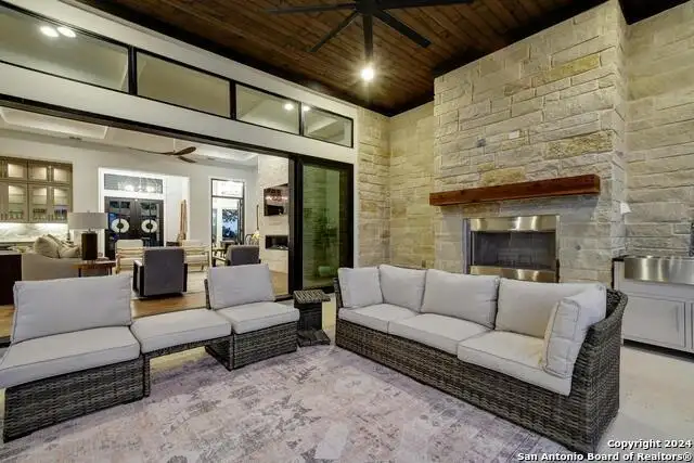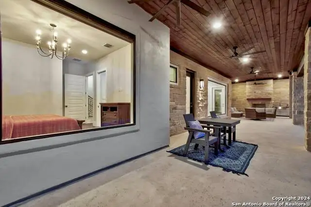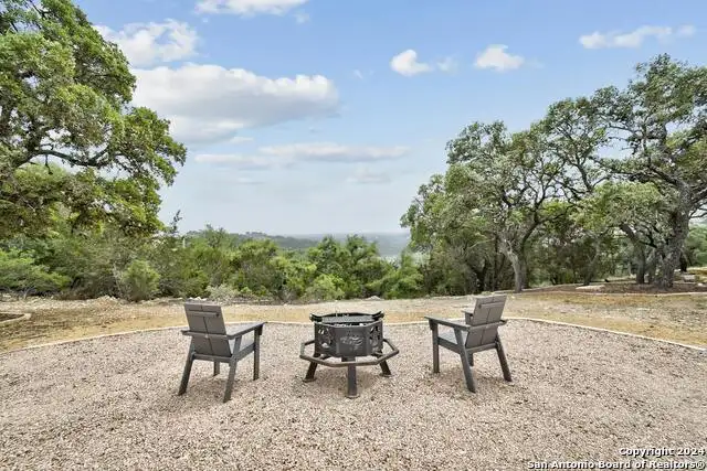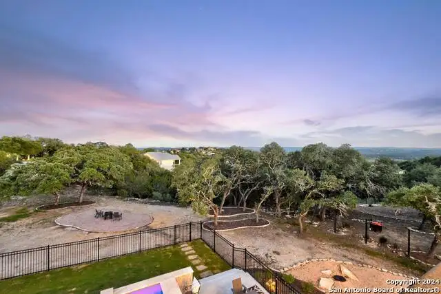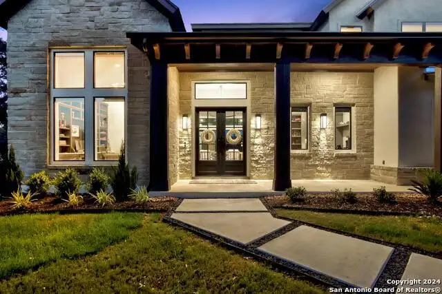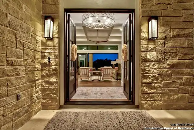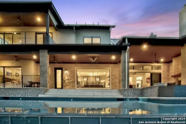 Nestled within the serene embrace of Mystic Shores in Spring Branch, Texas, awaits a modern Texas Hill Country masterpiece, a sanctuary of luxury and elegance. Welcome to a residence where every detail speaks of refined taste and meticulous craftsmanship, offering a lifestyle of unparalleled comfort and sophistication. Featuring 4415 square feet, 4 bedrooms, 3 full bath, 2 half bath, and an air conditioned 4 car garage with epoxy flooring that comes with a car lift (this is for the most discerning car aficionado). As you approach this stunning home, its grandeur is evident from the outset. An impressive facade beckons you to step through 8-foot double iron & glass doors, into a realm of timeless beauty and contemporary allure. This residence epitomizes spaciousness and grace. Upon entering, you're greeted by an expansive open-concept design, where natural light dances through windows that span the rear of the home. The ambiance is warm and inviting, anchored by wide plank solid hardwood floors that exude understated luxury. Directly to the left, a spacious study awaits, featuring double iron glass doors, soaring cathedral beamed ceiling, and wall-to-wall solid wood black built-ins adding a touch of sophistication, creating the perfect environment for productivity and inspiration. The heart of the home lies in the chef's kitchen, where culinary dreams come to life. Custom wood cabinetry reaches to the ceiling, complemented by rare luxury Ijen Blue Quartzite counters and an Italian- imported Bertazonni appliance package. A dual fuel range with a steam oven and warming drawer, along with two dishwashers and an oversized Thermador refrigerator, ensure that every meal is prepared with precision and style. For added convenience, a secondary caterer's kitchen provides extra storage, workspace, and contemporary floating shelves. Adjacent to the kitchen, a dual refrigerator wine bar awaits, inviting you to indulge in the finer things in life. The spacious dining area offers breathtaking views of the backyard oasis, seamlessly blending indoor and outdoor living. The primary retreat is a haven of tranquility, featuring a lovely sitting area and an exquisitely finished spa bath with double vanities, a huge walk-in shower, and a luxurious soaker tub. Perhaps the crowning jewel is the nearly 200 square foot primary closet, boasting wall-to-wall built-ins and island storage for the ultimate in organization and style. A guest suite completes the downstairs layout, offering privacy and comfort for visiting guests. Upstairs, a world of entertainment awaits, with a game room featuring a full wet bar and custom cabinetry. Backlit Blue Agate counters add a touch of glamour, while the adjacent media room provides a truly immersive movie experience with a Atmos theater package. Two additional guest rooms, each with private vanities and a shared bath area, offer ample space for loved ones to relax and unwind. Outside, a breathtaking panorama awaits, with views of the majestic Hill Country, the sparkling waters of the Guadalupe River, and a beautifully designed fenced in pool/heated spa, and expansive outdoor living space. This home is a masterpiece, designed for the homeowner looking for exquisite finishes. Experience the epitome of luxury living in the heart of Texas Hill Country.