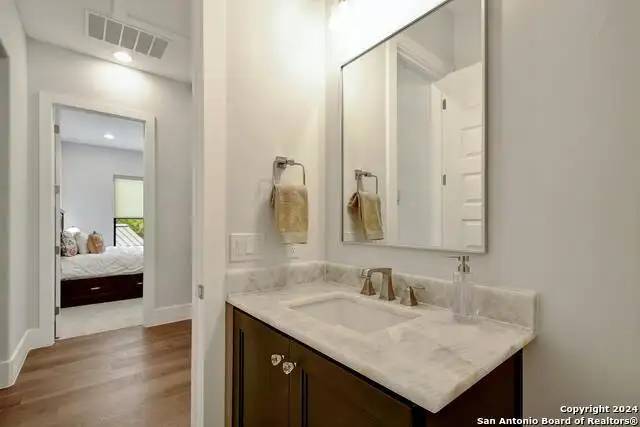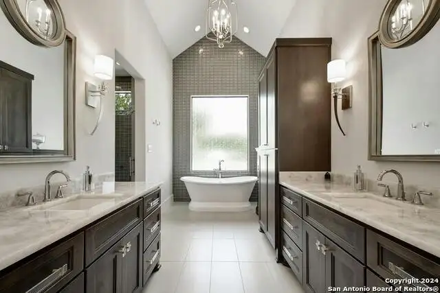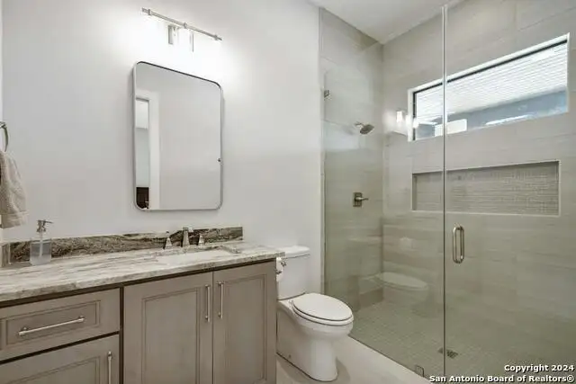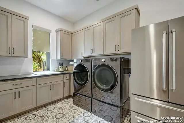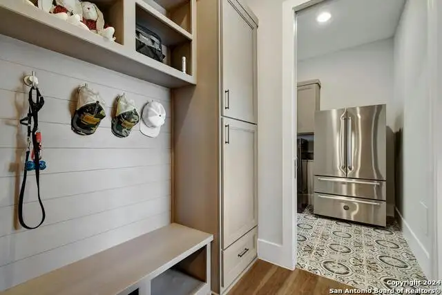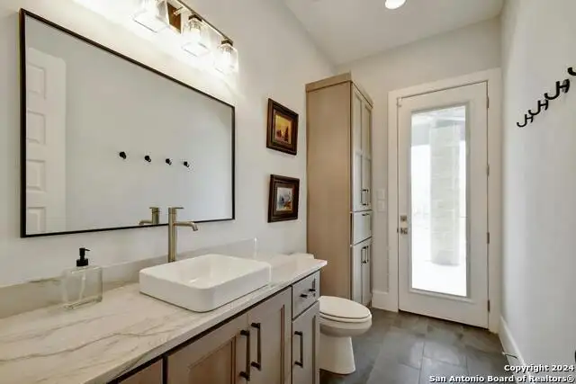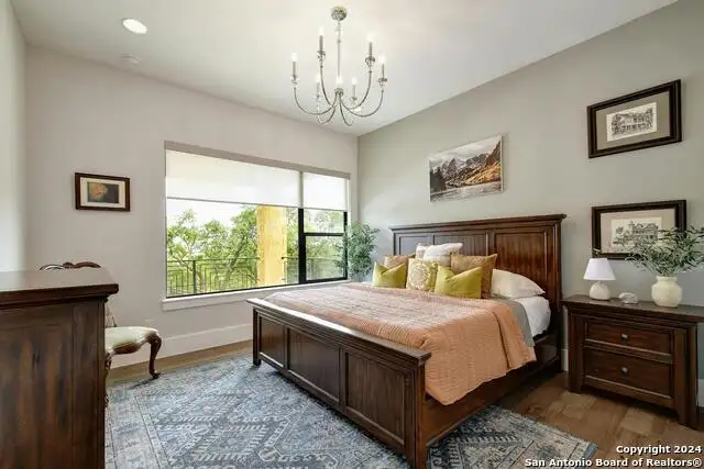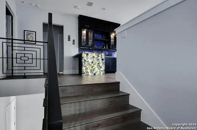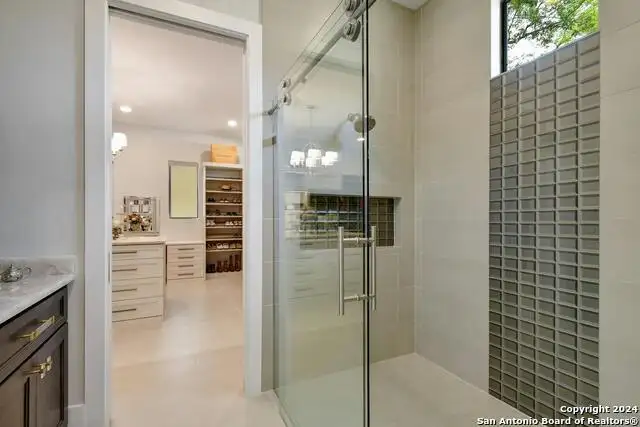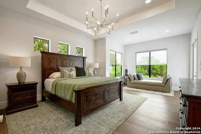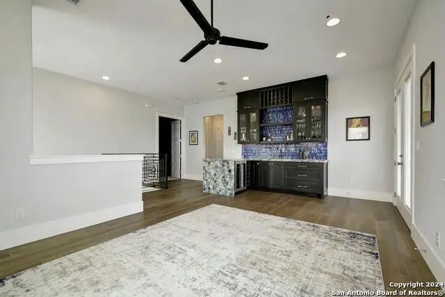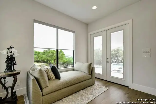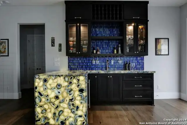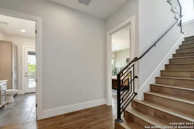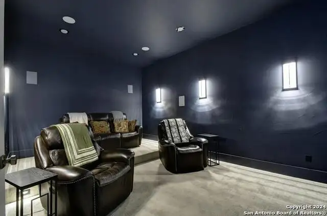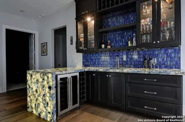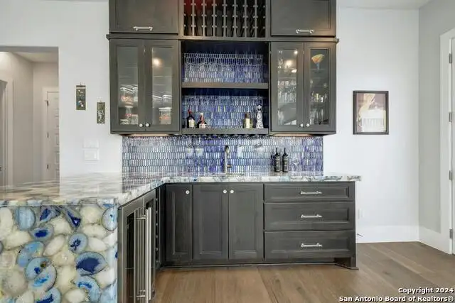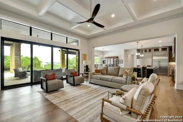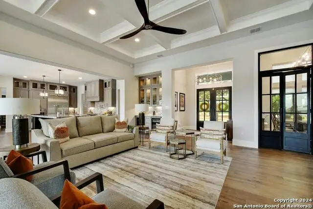 Nestled within the serene embrace of Mystic Shores in Spring Branch, Texas, awaits a modern Texas Hill Country masterpiece, a sanctuary of luxury and elegance. Welcome to a residence where every detail speaks of refined taste and meticulous craftsmanship, offering a lifestyle of unparalleled comfort and sophistication. Featuring 4415 square feet, 4 bedrooms, 3 full bath, 2 half bath, and an air conditioned 4 car garage with epoxy flooring that comes with a car lift (this is for the most discerning car aficionado). As you approach this stunning home, its grandeur is evident from the outset. An impressive facade beckons you to step through 8-foot double iron & glass doors, into a realm of timeless beauty and contemporary allure. This residence epitomizes spaciousness and grace. Upon entering, you're greeted by an expansive open-concept design, where natural light dances through windows that span the rear of the home. The ambiance is warm and inviting, anchored by wide plank solid hardwood floors that exude understated luxury. Directly to the left, a spacious study awaits, featuring double iron glass doors, soaring cathedral beamed ceiling, and wall-to-wall solid wood black built-ins adding a touch of sophistication, creating the perfect environment for productivity and inspiration. The heart of the home lies in the chef's kitchen, where culinary dreams come to life. Custom wood cabinetry reaches to the ceiling, complemented by rare luxury Ijen Blue Quartzite counters and an Italian- imported Bertazonni appliance package. A dual fuel range with a steam oven and warming drawer, along with two dishwashers and an oversized Thermador refrigerator, ensure that every meal is prepared with precision and style. For added convenience, a secondary caterer's kitchen provides extra storage, workspace, and contemporary floating shelves. Adjacent to the kitchen, a dual refrigerator wine bar awaits, inviting you to indulge in the finer things in life. The spacious dining area offers breathtaking views of the backyard oasis, seamlessly blending indoor and outdoor living. The primary retreat is a haven of tranquility, featuring a lovely sitting area and an exquisitely finished spa bath with double vanities, a huge walk-in shower, and a luxurious soaker tub. Perhaps the crowning jewel is the nearly 200 square foot primary closet, boasting wall-to-wall built-ins and island storage for the ultimate in organization and style. A guest suite completes the downstairs layout, offering privacy and comfort for visiting guests. Upstairs, a world of entertainment awaits, with a game room featuring a full wet bar and custom cabinetry. Backlit Blue Agate counters add a touch of glamour, while the adjacent media room provides a truly immersive movie experience with a Atmos theater package. Two additional guest rooms, each with private vanities and a shared bath area, offer ample space for loved ones to relax and unwind. Outside, a breathtaking panorama awaits, with views of the majestic Hill Country, the sparkling waters of the Guadalupe River, and a beautifully designed fenced in pool/heated spa, and expansive outdoor living space. This home is a masterpiece, designed for the homeowner looking for exquisite finishes. Experience the epitome of luxury living in the heart of Texas Hill Country.