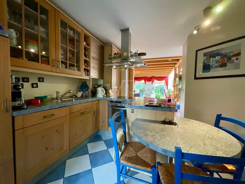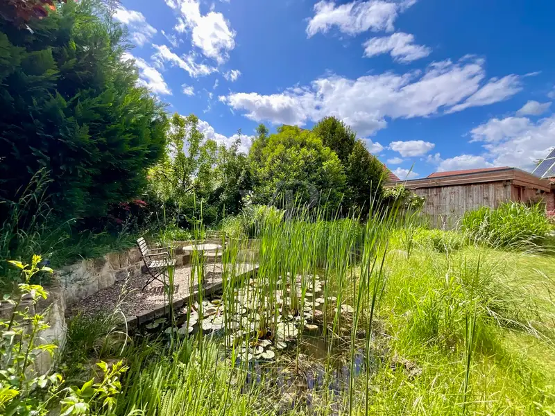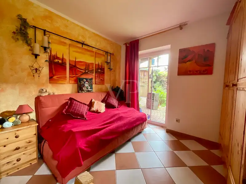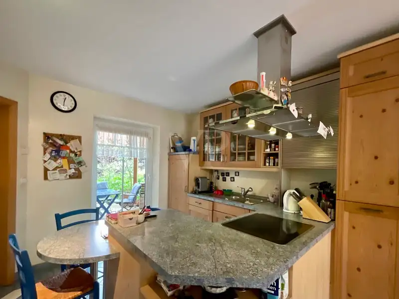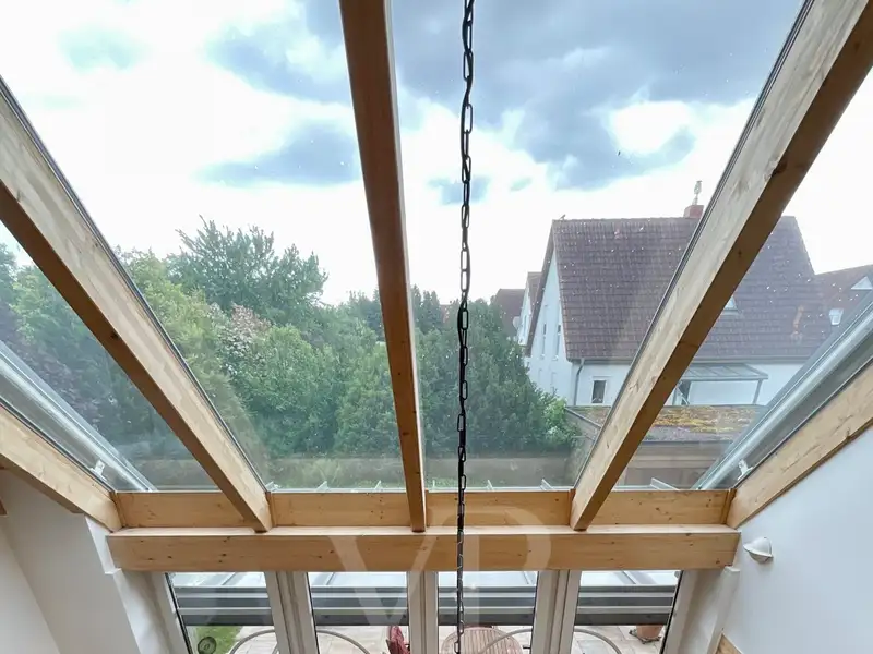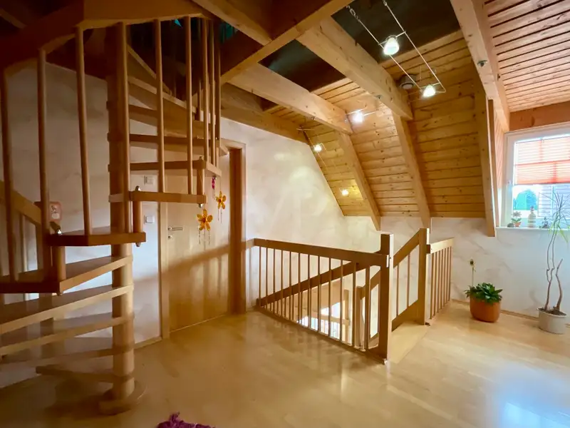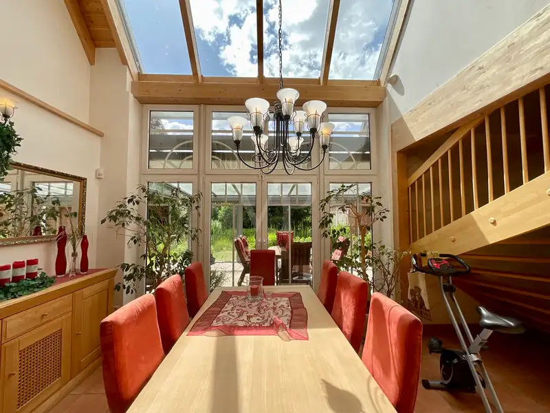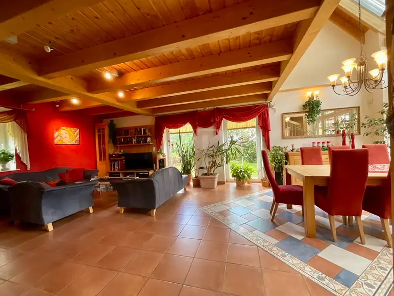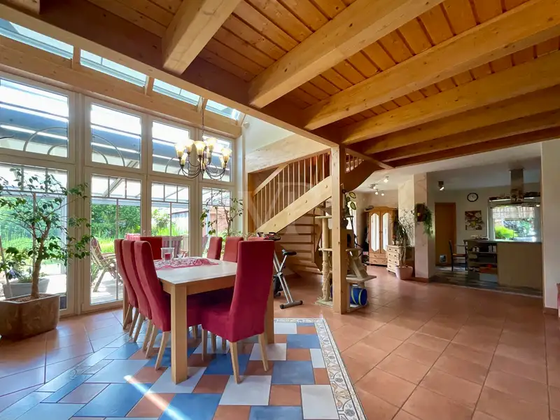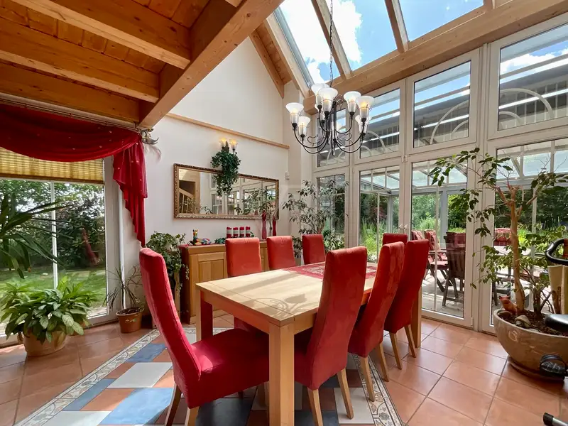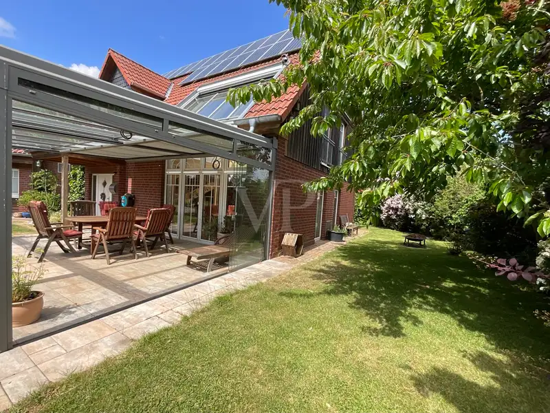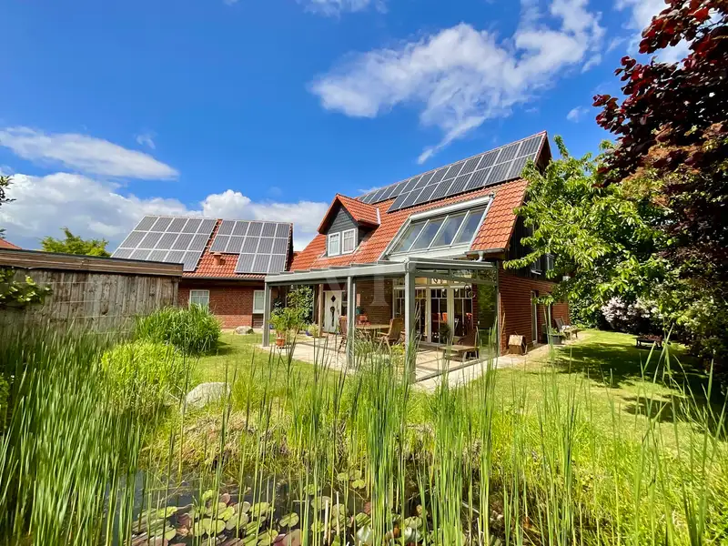 With this real estate offer, Von Poll Immobilien Hannover Region Süd presents a unique real estate ensemble from 2001. The property consists of a main house with approx. 149 m² of living space, plus a converted loft, and a granny apartment with approx. 60 m². Visually, the house in which the granny apartment is located presents itself as a small twin of the main house. Both houses can be entered separately but are connected via the shared utility room. This allows for different usage concepts. From multi-generational living, living and renting to living and working under one roof, everything is conceivable here! The property impresses with its spacious, open-plan layout and modern, transparent architecture. The use of natural materials, in combination with the many floor-to-ceiling window and door elements, contributes to a cozy living ambience with a vacation character. The living area is characterized by the design of the ceiling area as a gallery room and the associated air space, providing brightness and open space right up to the roof! The glazed roof area in this air space, which merges seamlessly into the wide window front, will delight you - it feels like living in a glass house that is flooded with light and sunshine. The adjoining summer garden is a welcome addition to the outdoor living room. The transparency in the living area is emphasized by additional patio doors that provide access to and a view of the beautifully landscaped garden. The open-plan kitchen with cooking counter and integrated dining area fits perfectly into this spacious living atmosphere. The house not only presents itself with a bright living ambience, but also with a floor plan that offers many amenities. There is a separate wing on the first floor, consisting of a room and a shower room. Ideally suited for guests, as a refuge for a young child or as a basis for ground-floor living in old age. The direct access from the kitchen to the utility room ensures short distances and also offers the possibility of accessing the granny apartment, so that the two houses merge here. From the utility room, you have direct access to the covered west-facing terrace, which can also be accessed from the kitchen of the granny apartment as well as from the guest room. This underlines the recreational value of the house, which continues on the top floor. A roof terrace is available here, which can be accessed from the bathroom, which is equipped with a bathtub, shower and sauna, as well as from the bedroom. This promises relaxing hours watching the sun go down before going to bed or guaranteed free time after a visit to the sauna! It is also possible to set up a fitness room, which can be accessed via the roof terrace. The outdoor area continues the holiday feeling. Various oases await you here to recharge your batteries. The highlight of the beautifully landscaped garden is the idyllic garden pond with its picturesque seating area, which invites you to daydream. The technical equipment of the house also leaves nothing to be desired (see equipment/description). All in all, you can expect a well-thought-out residential ensemble that combines a wide range of living and usage options under one roof and pampers you with comfort and great recreational and leisure value. The architectural sophistication paired with the high-quality furnishings and attractive interior will win you over. The bright, open-plan living ambience, which is complemented by the outdoor leisure facilities, is particularly appealing to freedom-loving prospective buyers who like to live generously and enjoy their time outdoors.