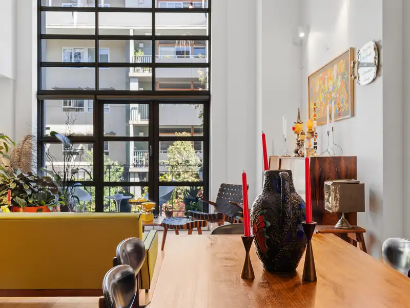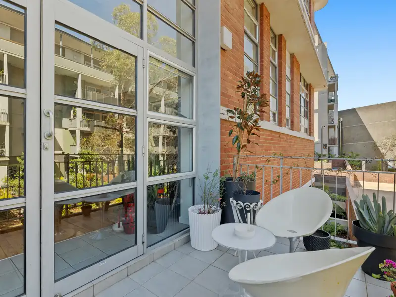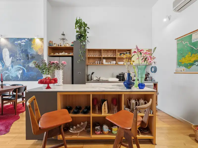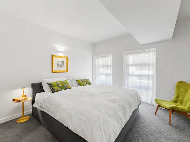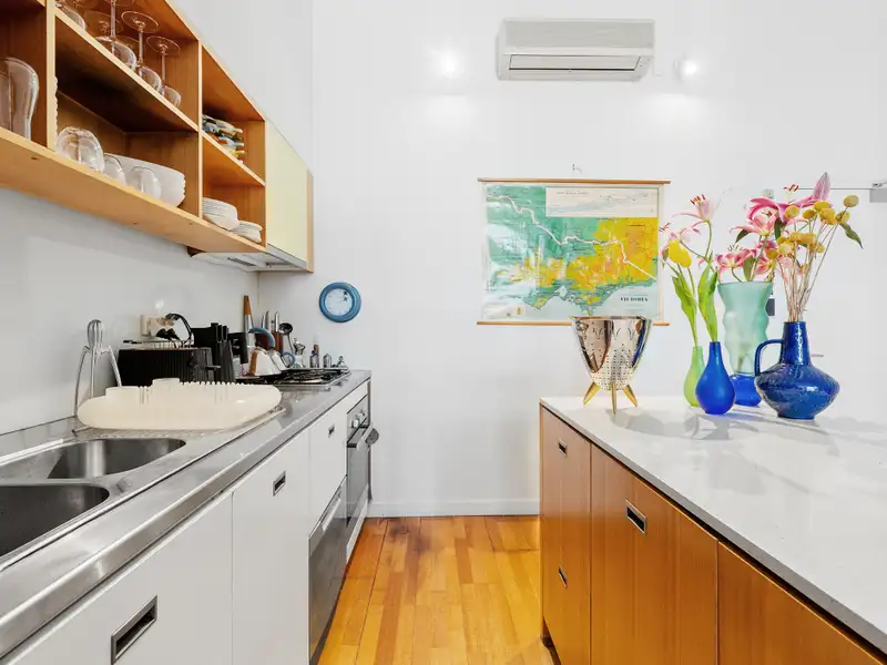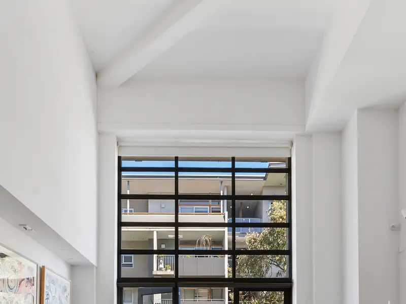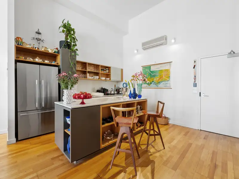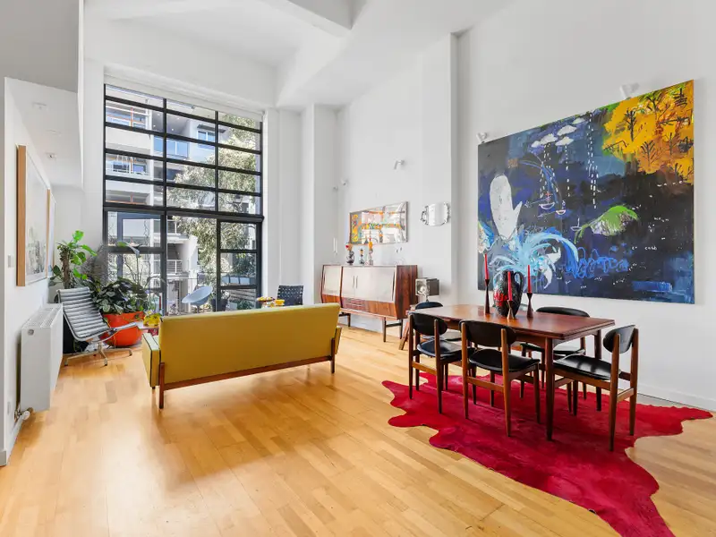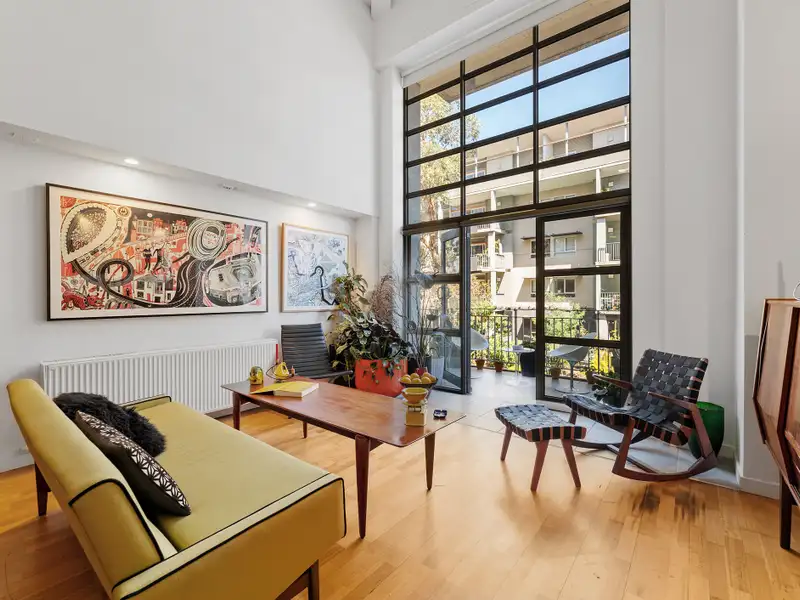 Set within a secure boutique complex on the quiet Blanche Street end of Barkly Street, the apartment boasts soaring double-height ceilings and expansive double-height windows, flooding the interiors with natural light. An open-plan living and dining domain flows seamlessly to a tranquil private terrace overlooking beautifully landscaped communal gardens – ideal for relaxing or entertaining.