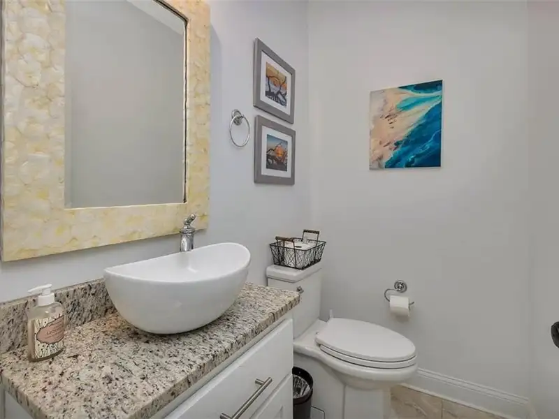 - Open kitchen with granite counters and stainless appliances