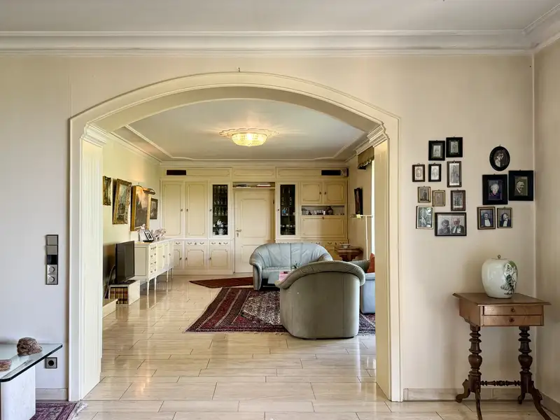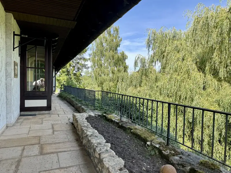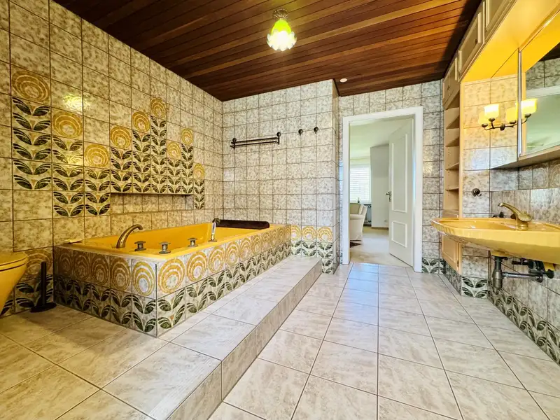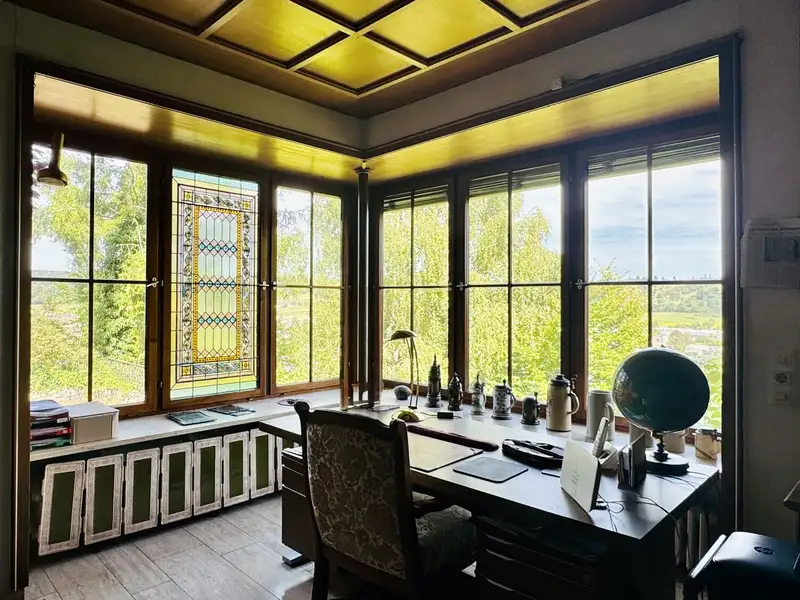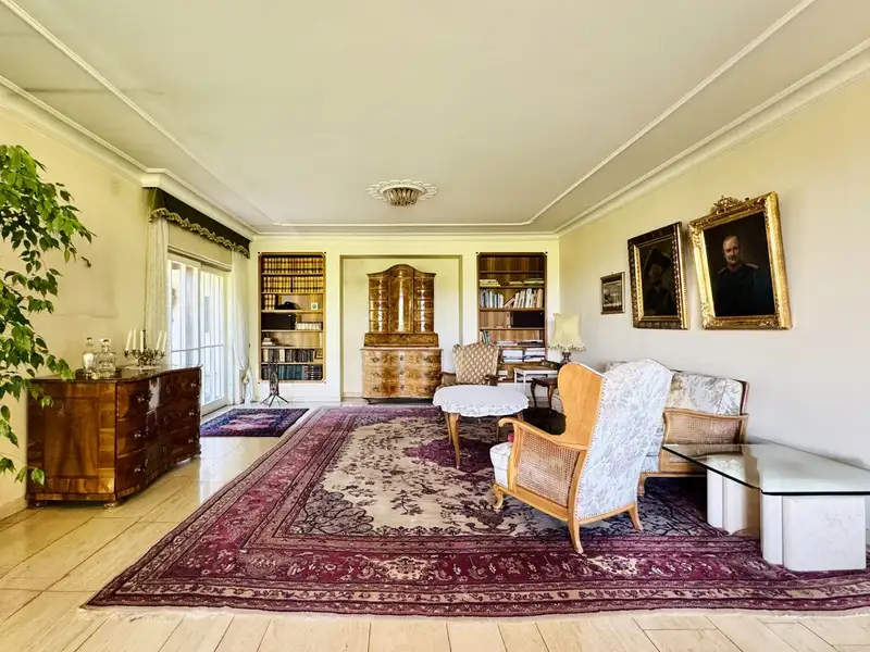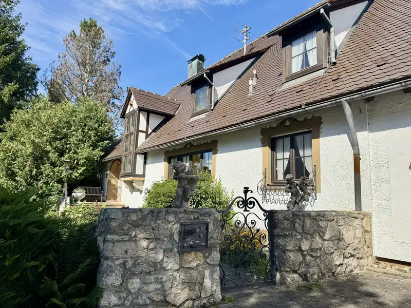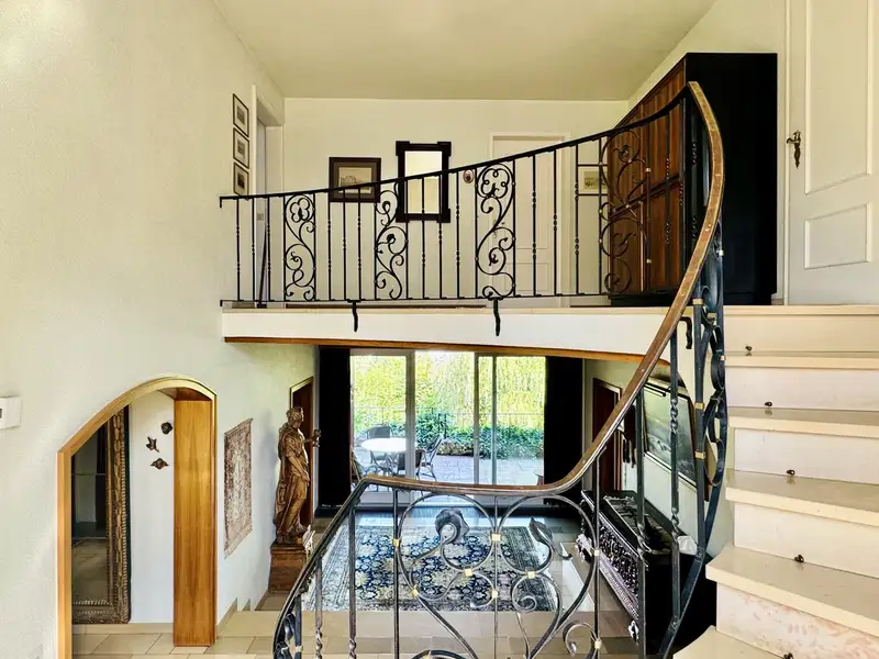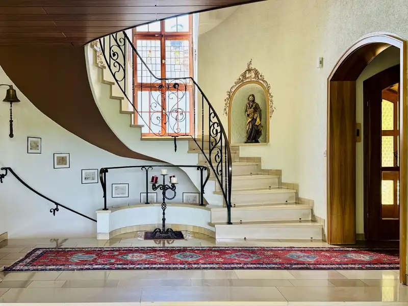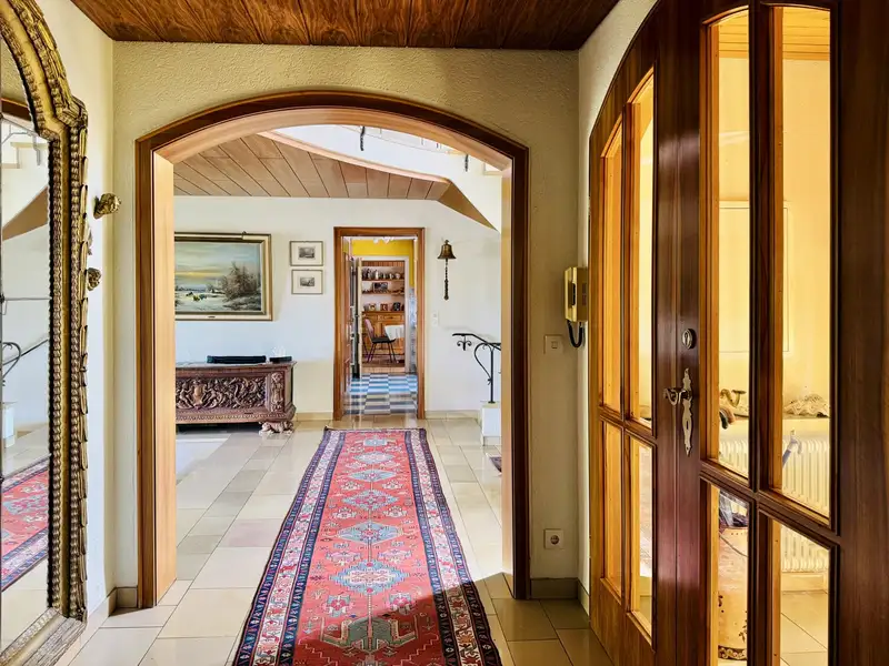 Completed in 1976, the house is in a well-kept condition and was built as a solid structure with half-timbered elements. As soon as you enter the entrance hall, you can feel the high-quality fittings: the natural stone floor harmonizes impressively with the elaborately crafted wrought iron railings and underlines the classic flair that runs through the entire property. The structured room layout creates functional areas that can be optimally adapted to the needs of families and professionals.