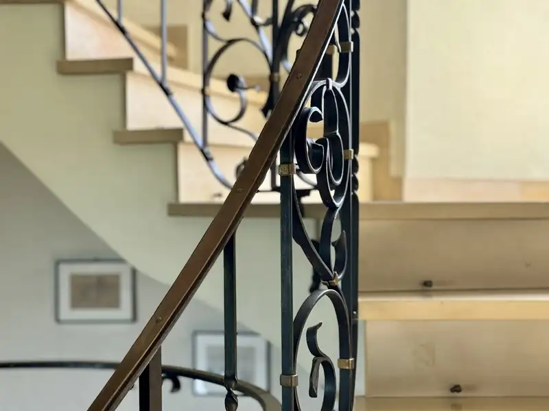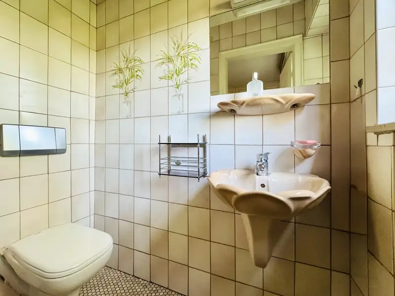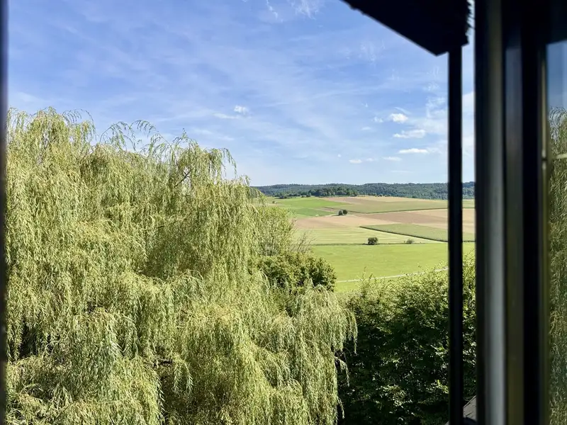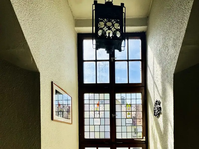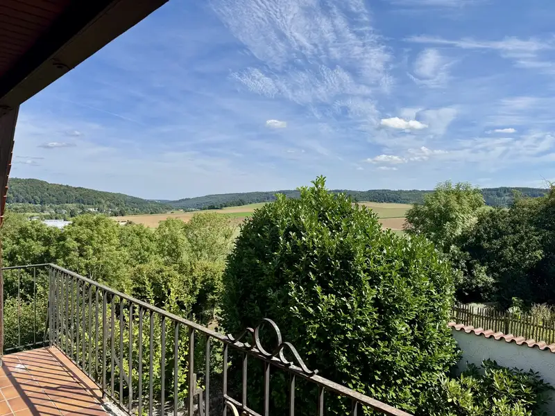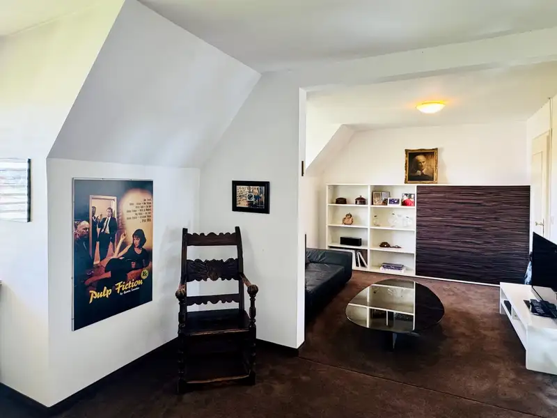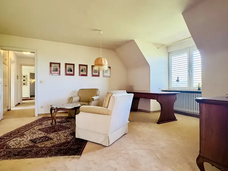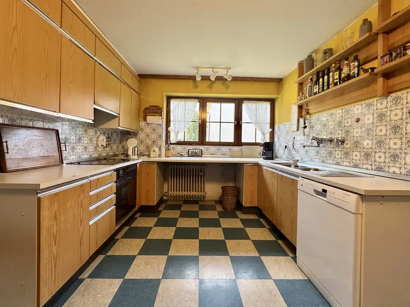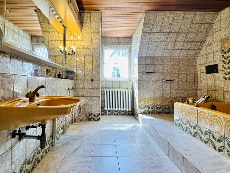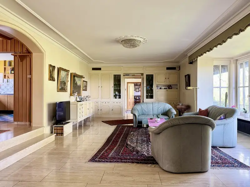 Completed in 1976, the house is in a well-kept condition and was built as a solid structure with half-timbered elements. As soon as you enter the entrance hall, you can feel the high-quality fittings: the natural stone floor harmonizes impressively with the elaborately crafted wrought iron railings and underlines the classic flair that runs through the entire property. The structured room layout creates functional areas that can be optimally adapted to the needs of families and professionals.