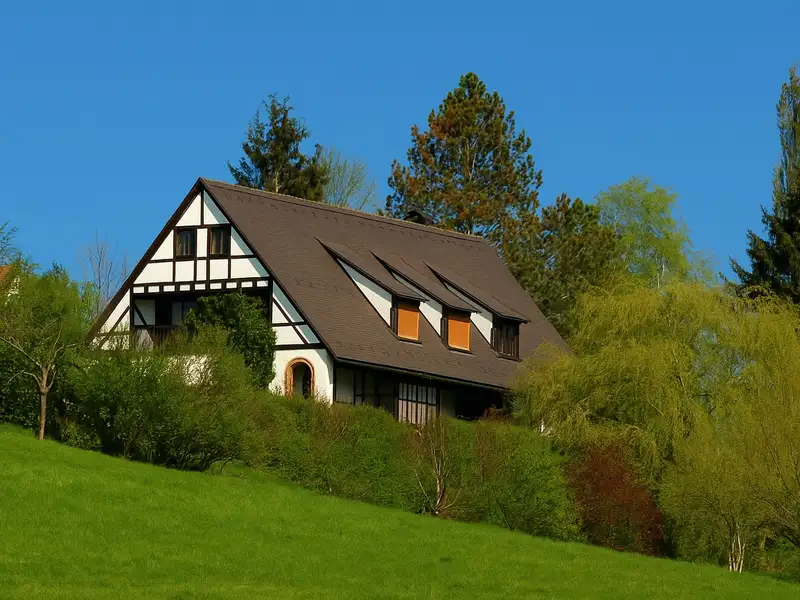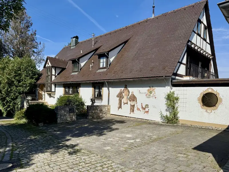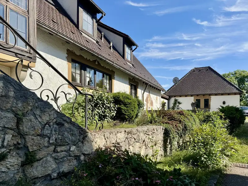 The combination of half-timbered elements and solid construction lends the building a timelessly classic character and underlines the unique architectural style of this property, which blends harmoniously into the natural surroundings.
