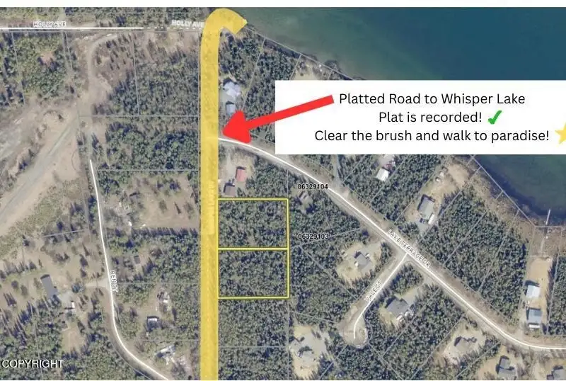 There's something, well a few things special about this lot. While it's not the only lot that's an acre and accessible by road -it is the only piece of property that's slightly more than ONE TENTH of a mile from the enchanting, float plane lake - appropriately dubbed "Whisper". Imagine building a cabin (go ahead, hook it up to electricity -- the power is right at the road) and picking berries to satisfy your summer cravings - harvest fireweed from the tiny shoots to its massive leaves; or grab a kayak and walk down to the lake for the day! For those of you that don't know winters in Alaska, it may be hard to imagine several months in the "Great White North" - but if you're imagining a struggle in darkness, that depiction couldn't be further from the truth. From this property, you can ice skate on the lake; watch the Northern Lights dance above your head; and sip hot coffee in the absolute stillness of the white landscape. You're right off Sterling Highway - so commuting to work, if that's a part of your world is easily accessible. Recreation and leisure can take place on your property, or right down the road on the iconic 80+ acre body of water, Whisper Lake. Here it is, world -- 43,560 Sq Ft of a sprawling spruce and birch forest with lake access about 700 ft away. There's no shortage of land for sale in Alaska - so I would be pulling your proverbial "leg" if I told you to "HURRY! This is the ONLY acre tract available". Jesting aside, I can assure you that this property is somewhat of a "unicorn". As a REALTOR® (I have to warn you, I'm not yelling - the "caps" is how the logo reads), I see a lot of properties, many of them I have the privilege of helping navigate the sale of - and this is truly one that I think has the best of ALL (purposely capitalized that for effect) worlds. Thank you for the privilege of sharing it with you. "All I need is a whisper in a world that only shouts" ~Passenger