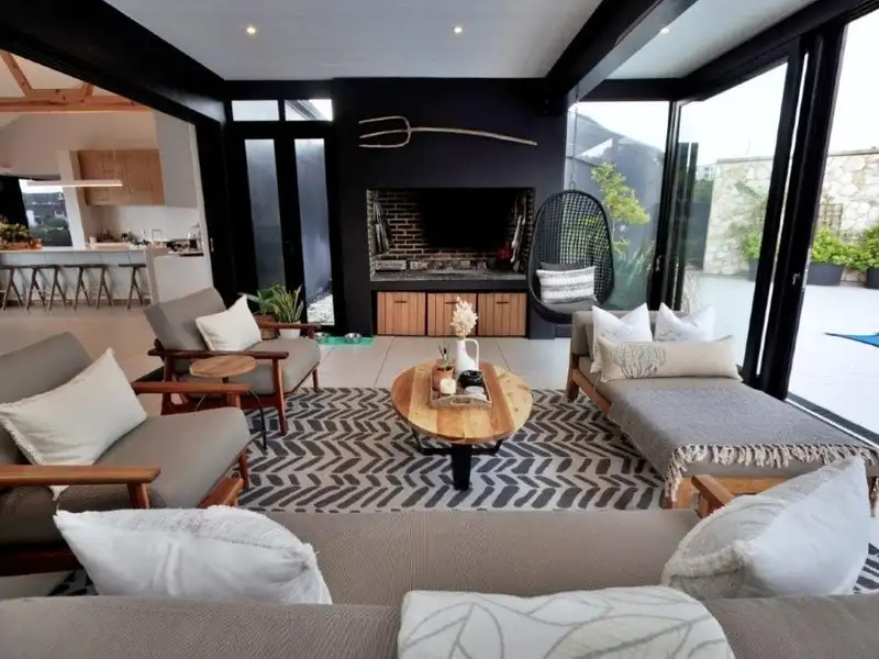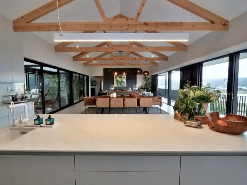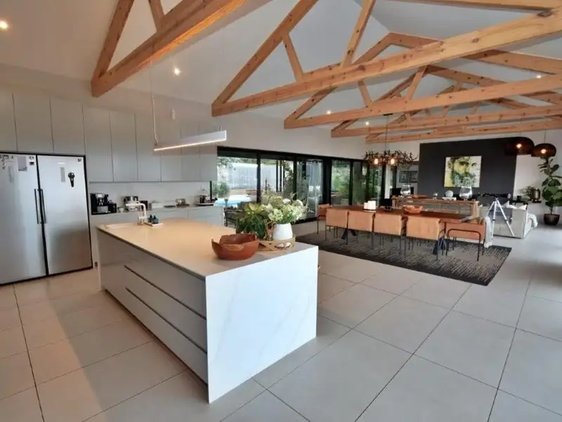 Step inside and experience light, space, and contemporary elegance. The open-plan living area, framed by striking exposed timber trusses, flows seamlessly into a designer kitchen with integrated appliances, stone countertops, and a central island ΓÇö the heart of the home. Expansive glass doors open completely to the front patio, blending indoor and outdoor living into one breathtaking experience.