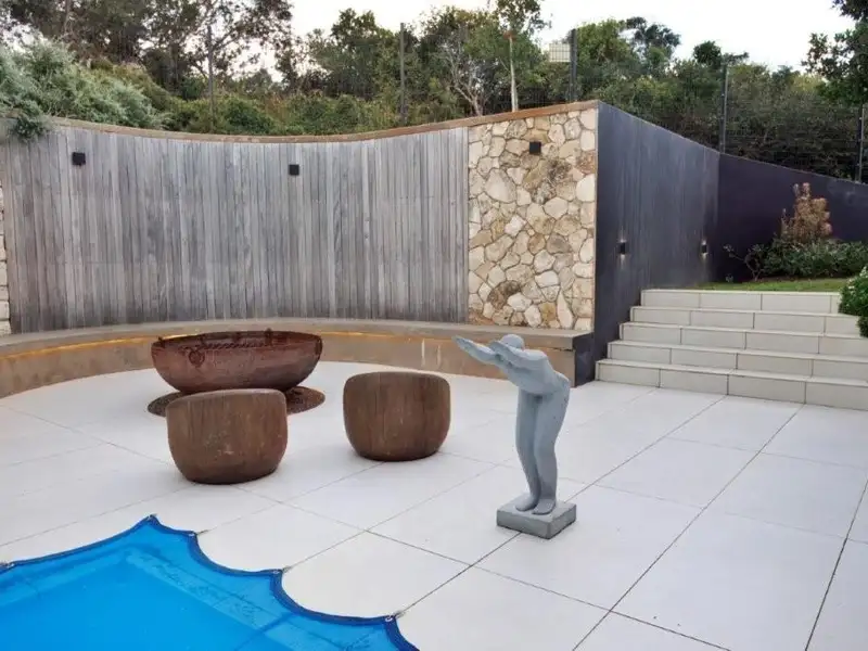 To the rear, a sophisticated entertainment area connects effortlessly to the sheltered pool terrace, creating the ideal space for summer afternoons, al fresco dining, and evenings under the stars.