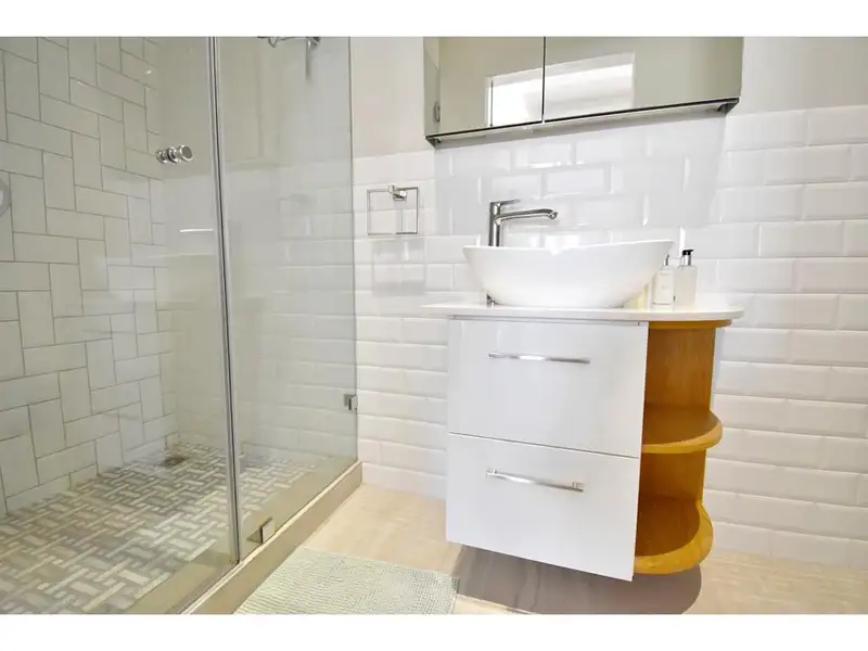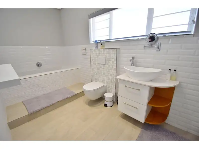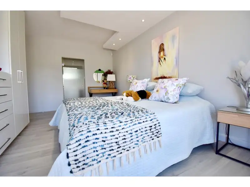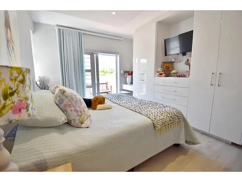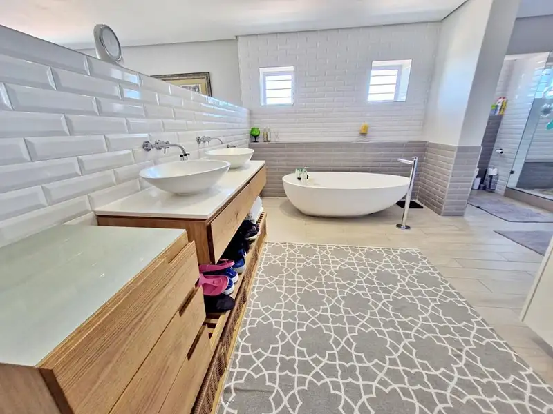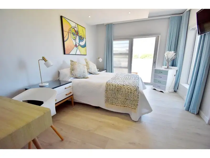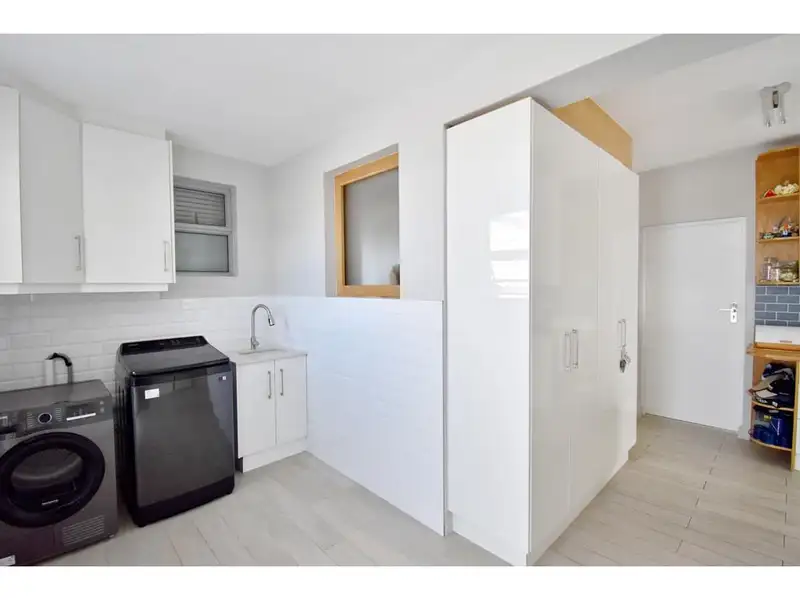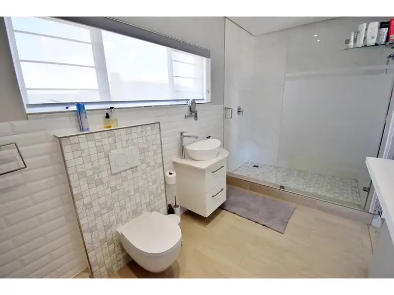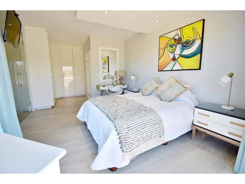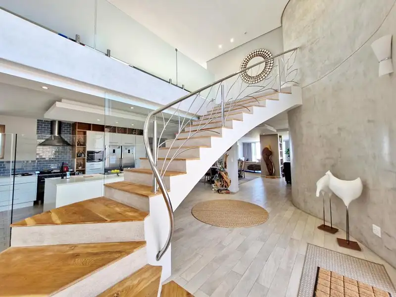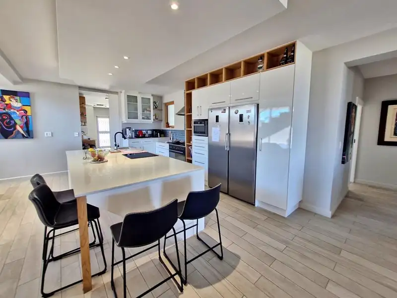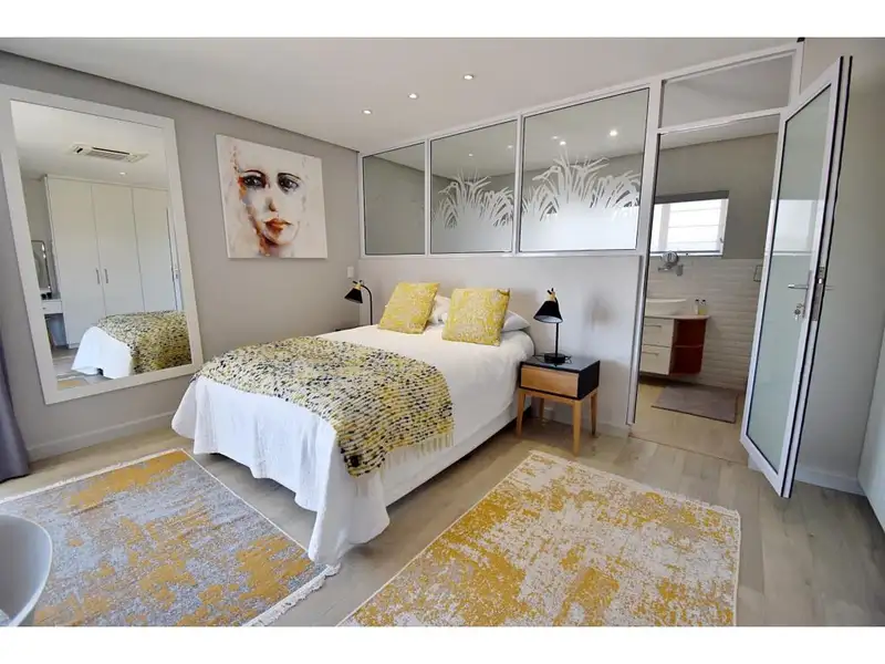 A private guest toilet and a gourmet kitchen, featuring a stylish kitchen island and a freestanding gas stove, are conveniently located. The expansive scullery and laundry areas can be discreetly closed off, ensuring a clutter-free living space. The ground floor also accommodates two double garages with direct access to the home, as well as a private guest bedroom with an en-suite bathroom, ideal for visiting family or staff. Additionally, two more bedrooms, each with an en-suite bathroom and sliding doors framing stunning sea views, complete the ground floor.