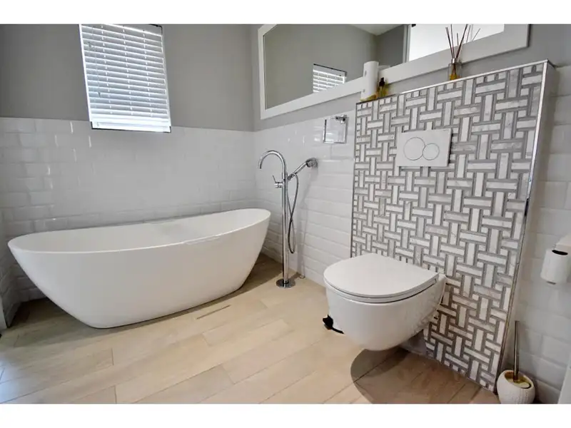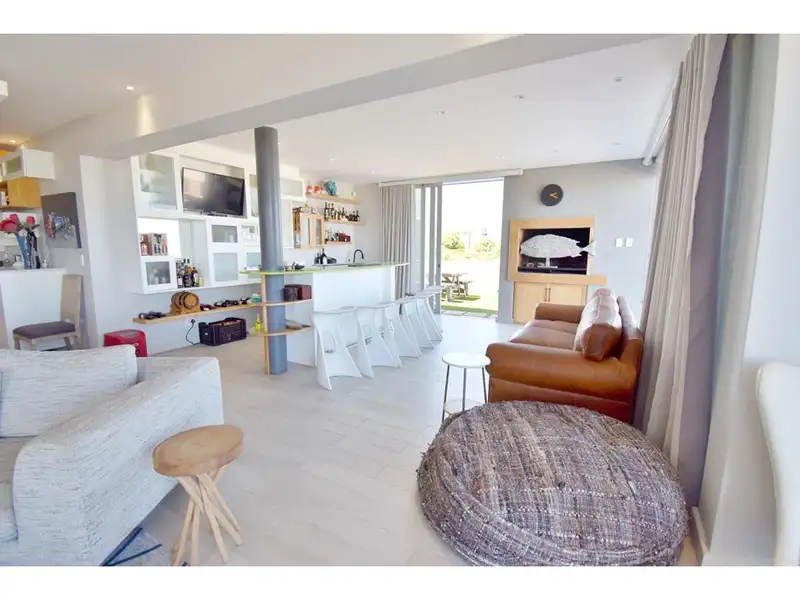 The ground floor unfolds into a series of generously proportioned open-plan living areas, thoughtfully designed to create a warm and inviting atmosphere. A spacious dining room, two cozy lounge areas, and a well-appointed bar area with an indoor braai seamlessly flow together. These inviting spaces open onto a sun-drenched wooden patio, complete with a sparkling swimming pool and a cozy firepit, perfect for al fresco dining and relaxation.