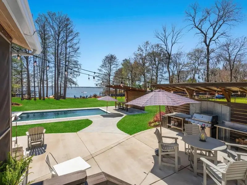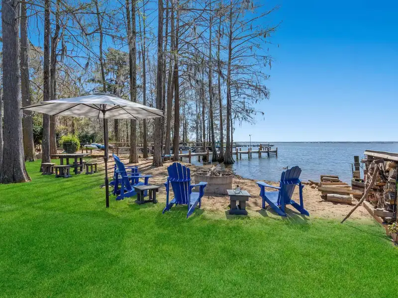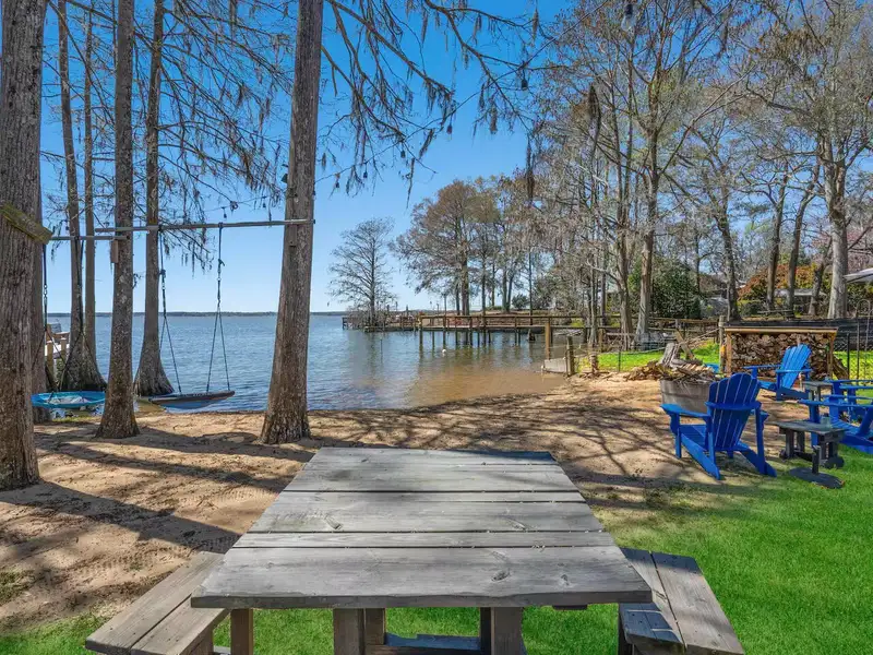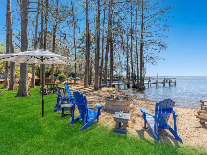 The property doesn't stop at manmade conveniences. Walk along your own sandy beach to a firepit and shady swings by the water's edge for delightful gatherings. Stroll down the dock to enjoy serene views across the water or perhaps to set sail on leisurely lake adventures.