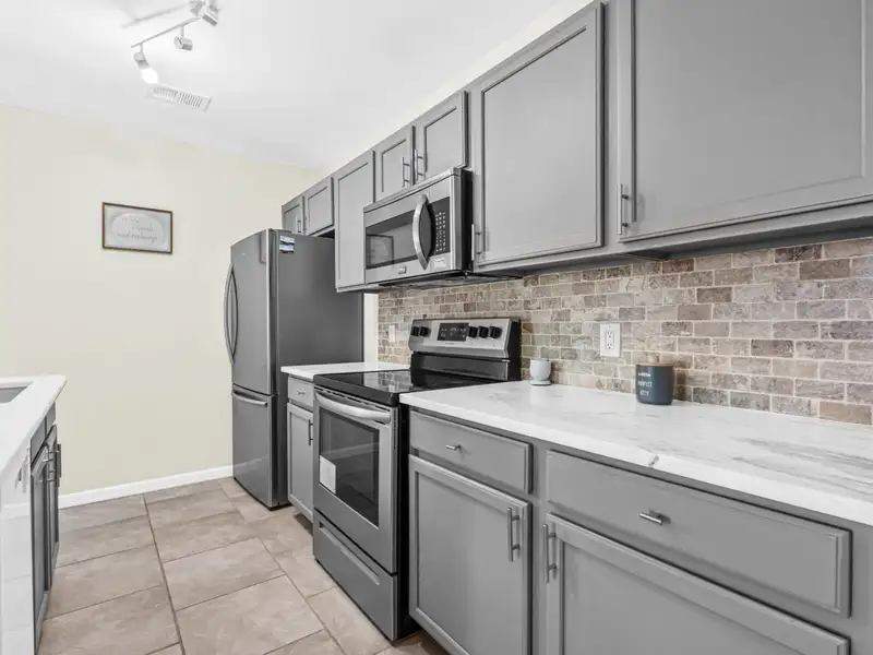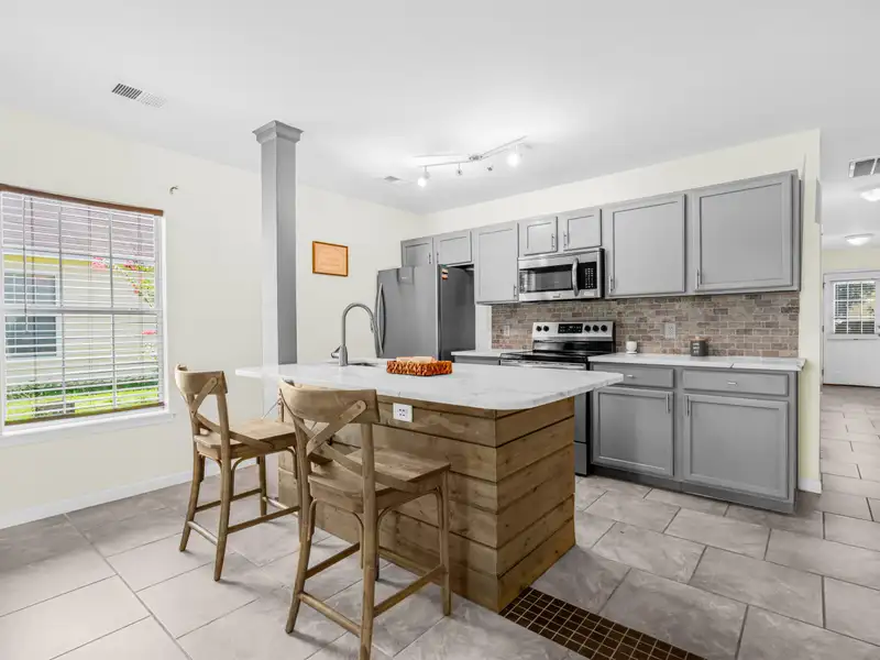 - Kitchen with marble counters and island