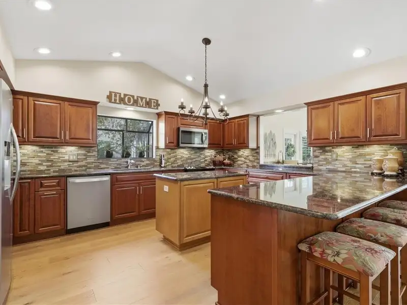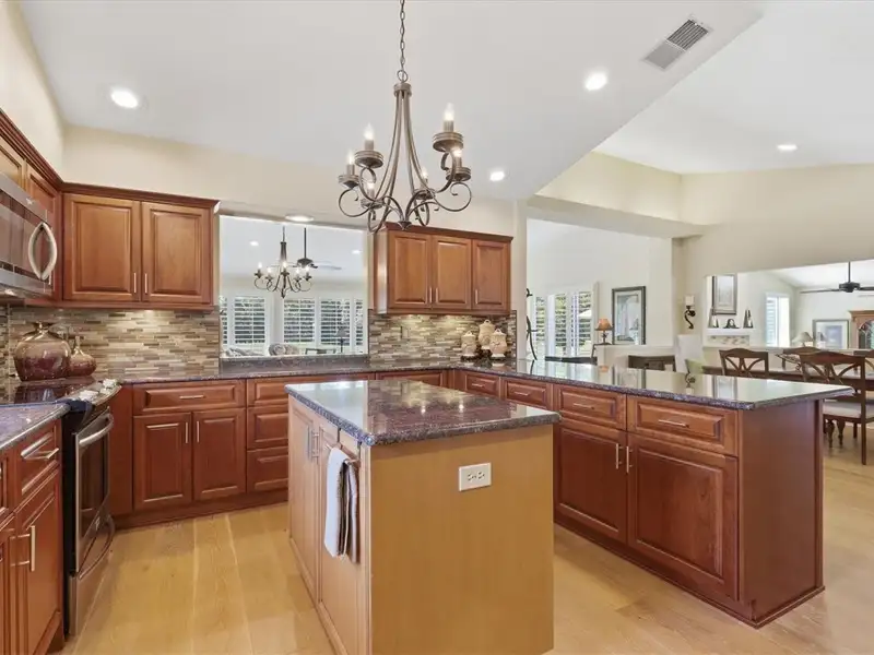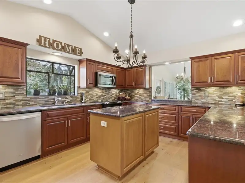 - Kitchen with granite counters and island