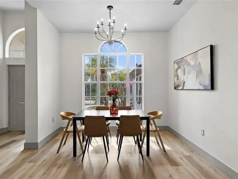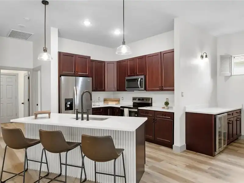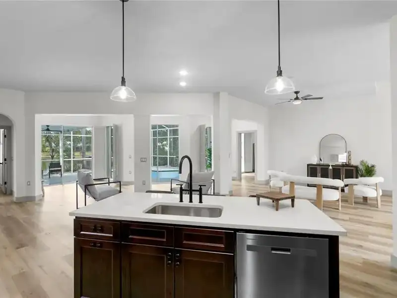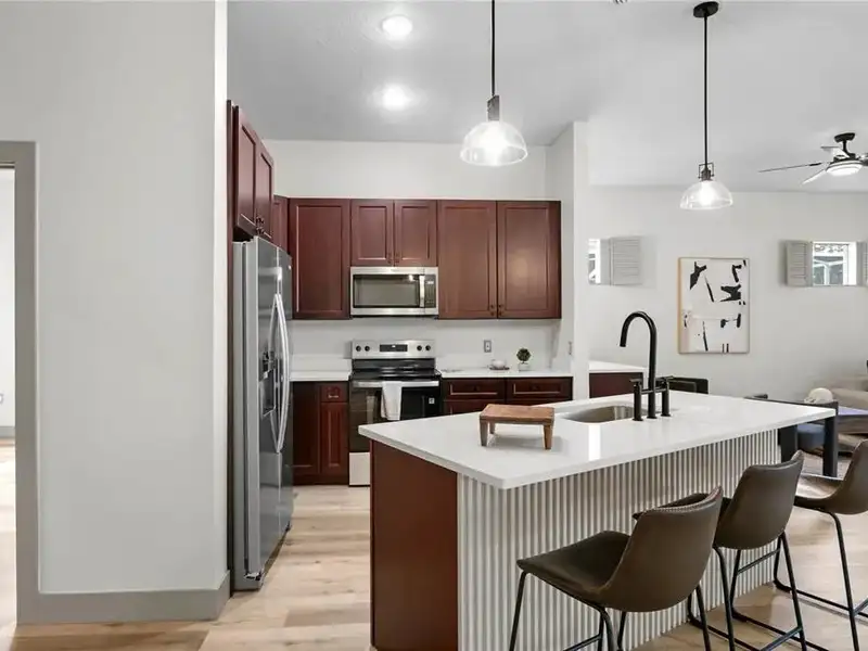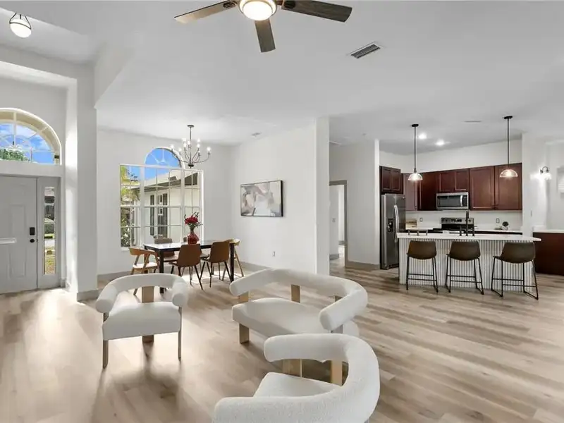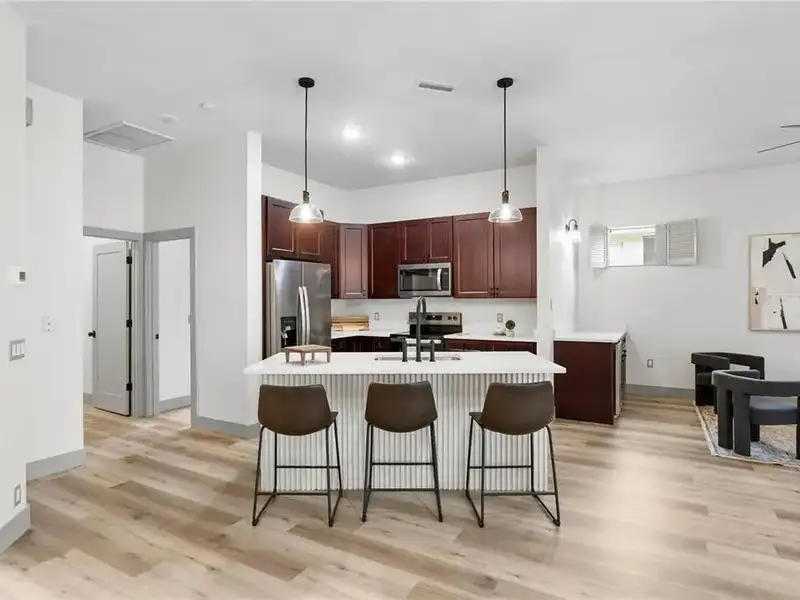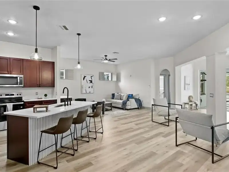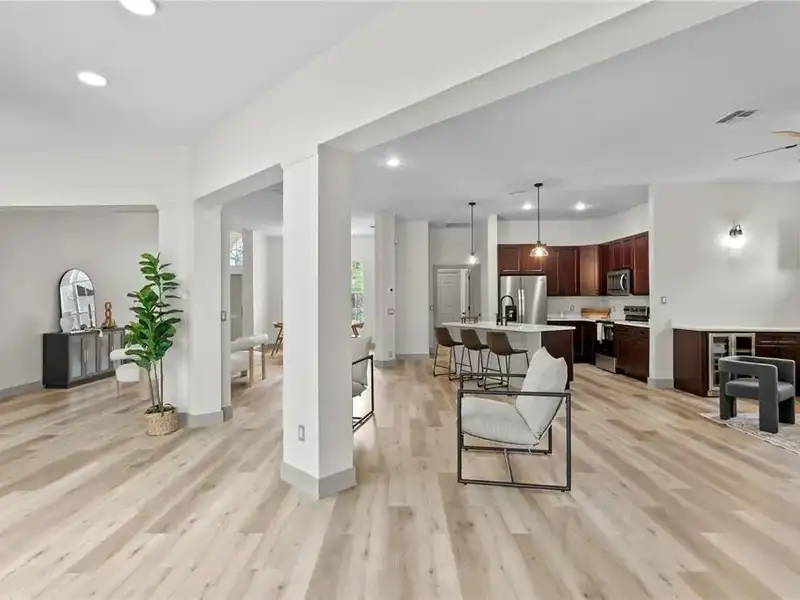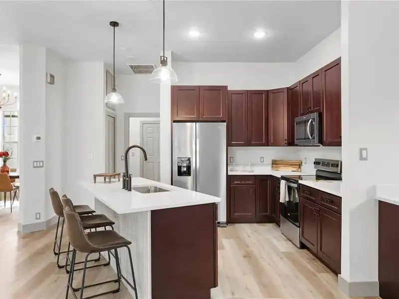 - Open chef’s kitchen with dining area