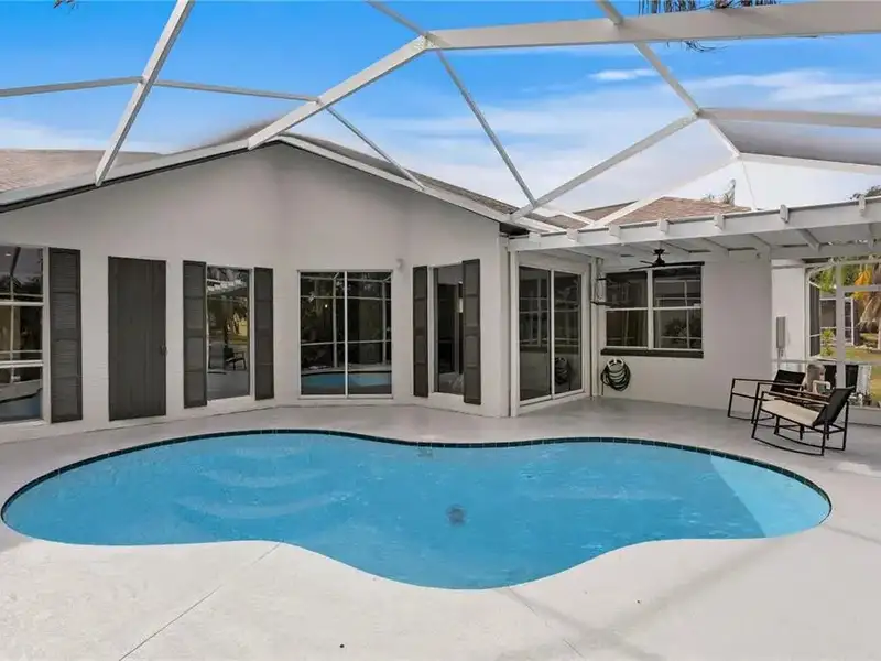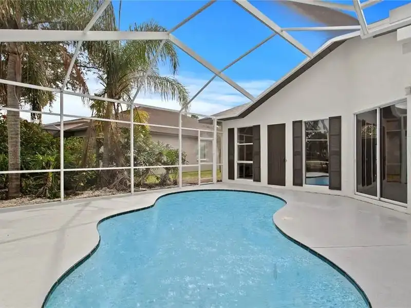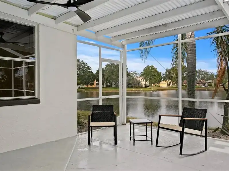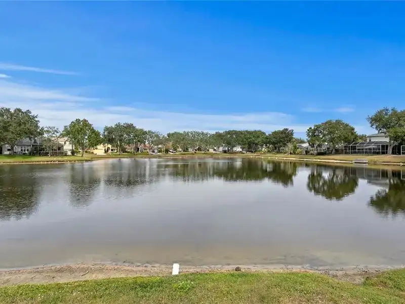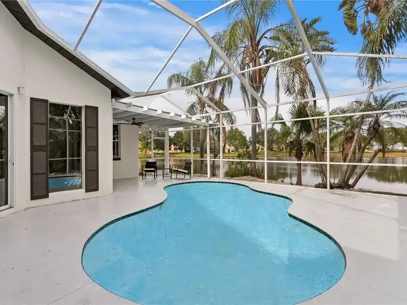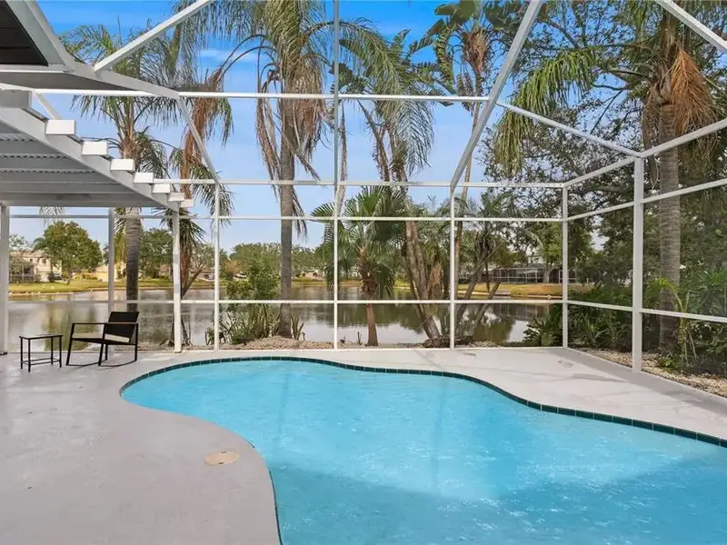 - Screened-in pool with pond views