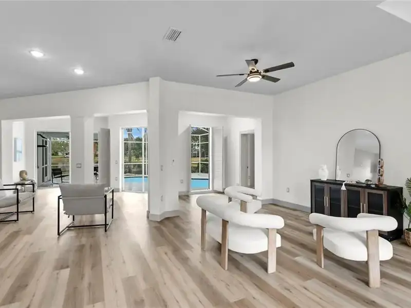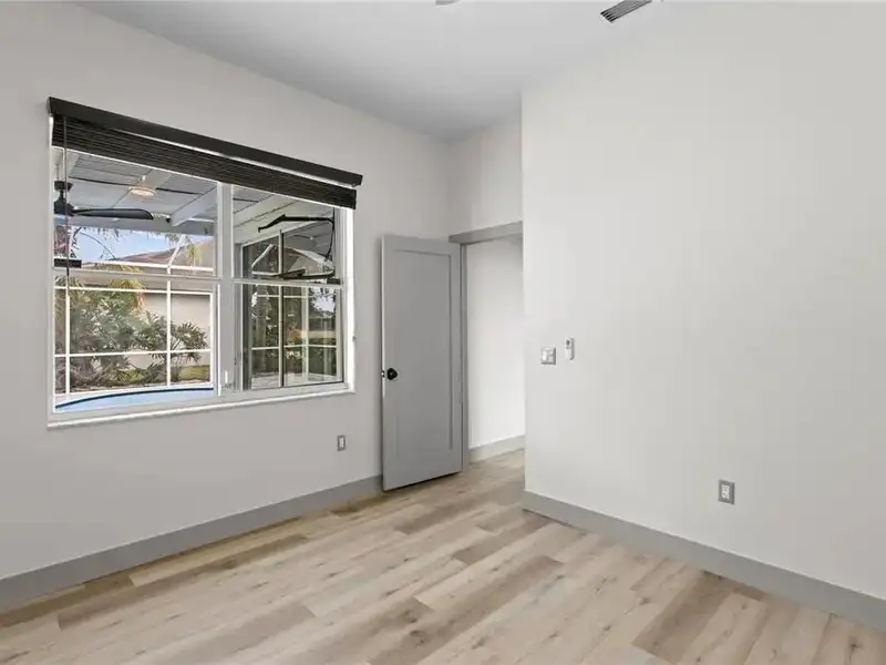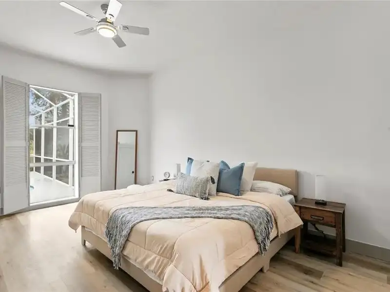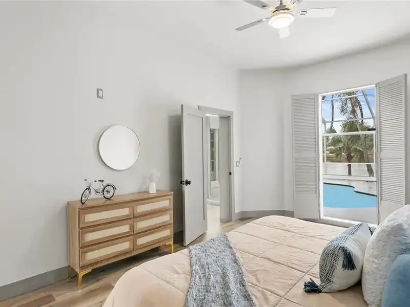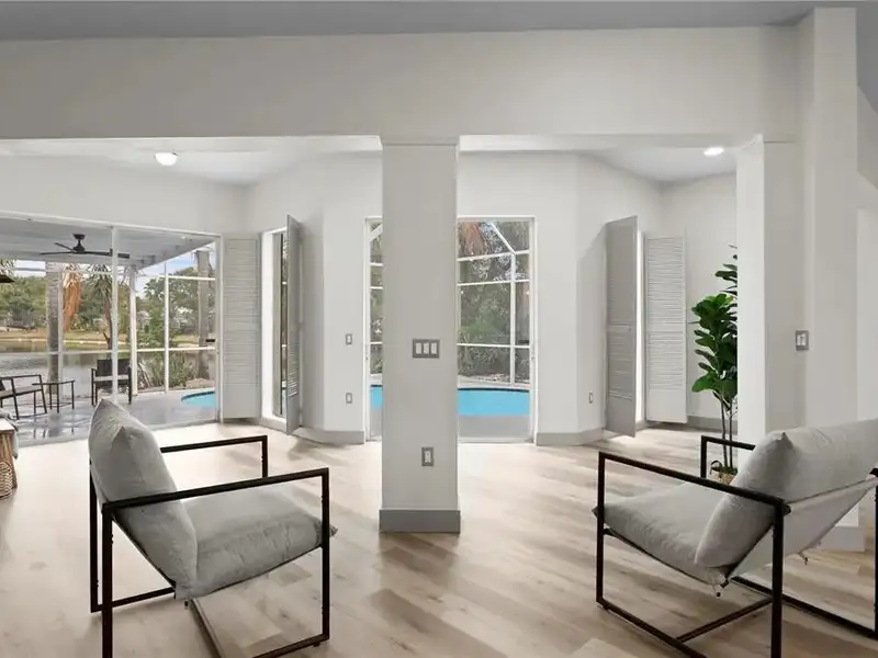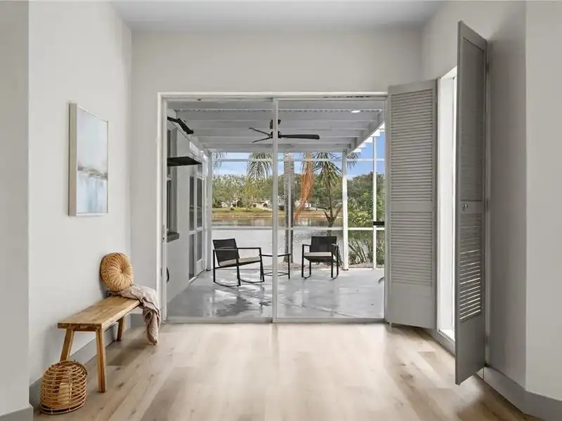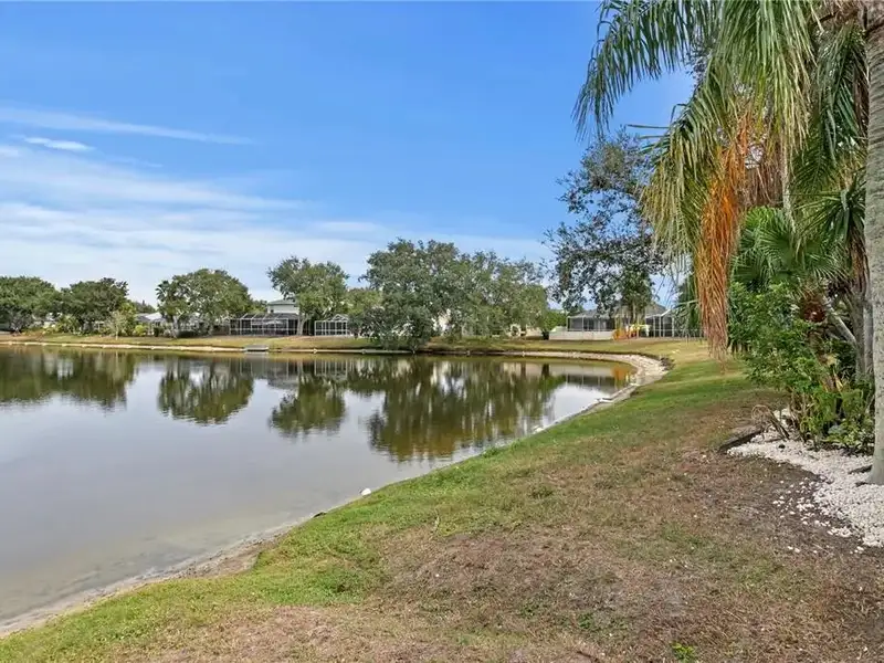 - Screened-in pool with pond views