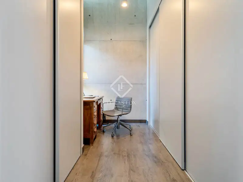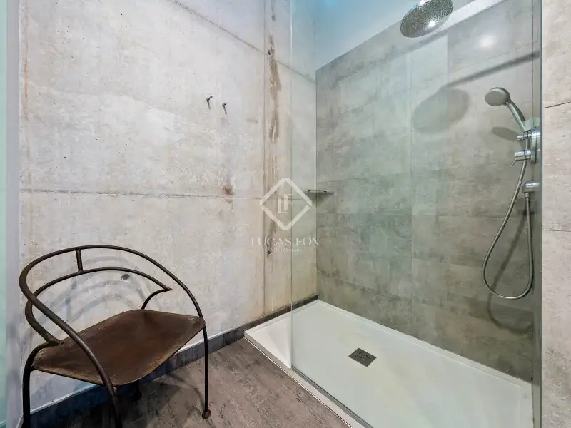 After passing through the front doors, a few rough concrete walls and a walkway access us to the main floor , where we find a completely open entrance hall . To the right, a double bedroom and a bathroom. At the back, the staircase takes center stage, surrounded by enormous windows, and to the left, a common space consisting of the dining room, the living room , and a modern open kitchen with a central island and a separate utility room . This day area is enclosed with glass and, for the most part, serves as the only separator from the exterior, providing light and spaciousness, merging the interior space of the house with the exterior of the garden and pool.