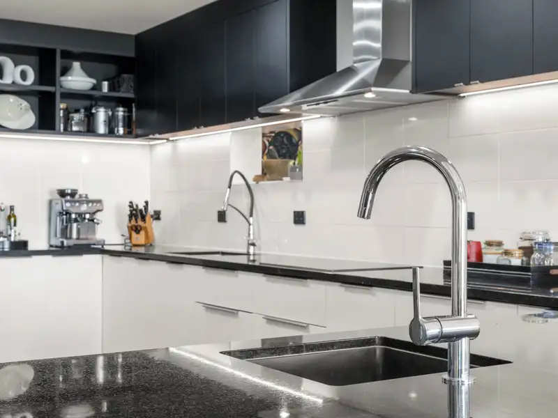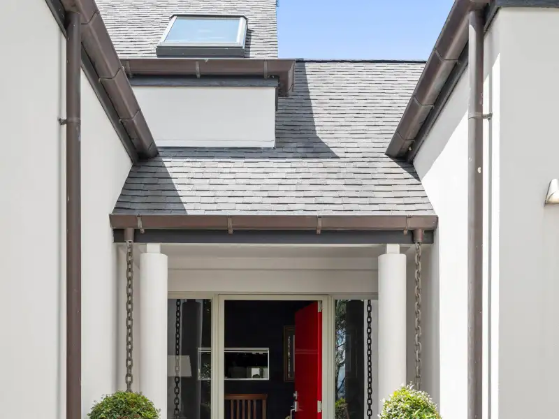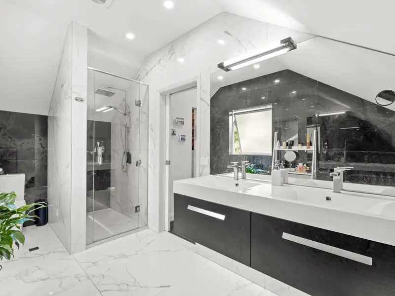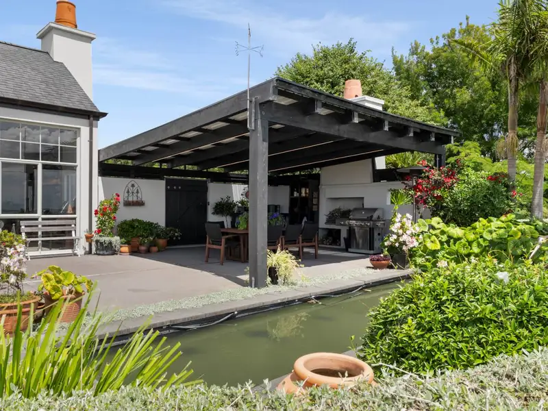 At the heart of the home is a bespoke kitchen overlooking the dining area and a soaring high-ceilinged sitting room — a warm family haven and an exceptional entertaining space. Large doors open to a lush, landscaped lawn and a gazebo-covered BBQ area, creating a seamless indoor-outdoor flow.