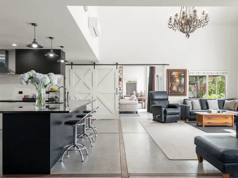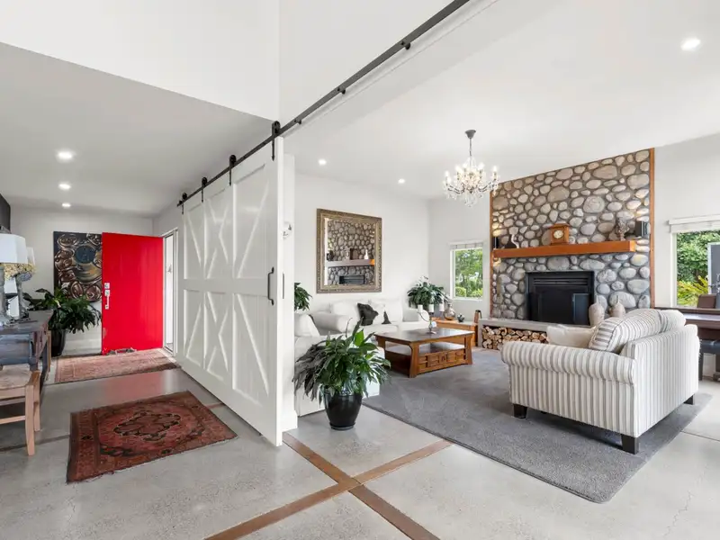 A striking barn door leads to the separate lounge, where a lodge-style stone fireplace with oak mantelpiece, subtle wall lighting, and a statement chandelier set the tone for elegant relaxation. Floor-to-ceiling north-facing windows frame panoramic Eastern Bay views.