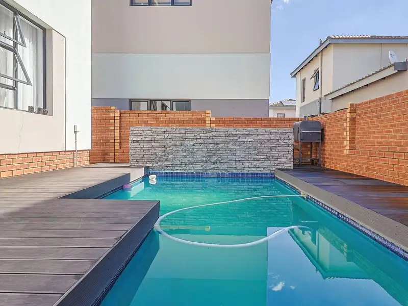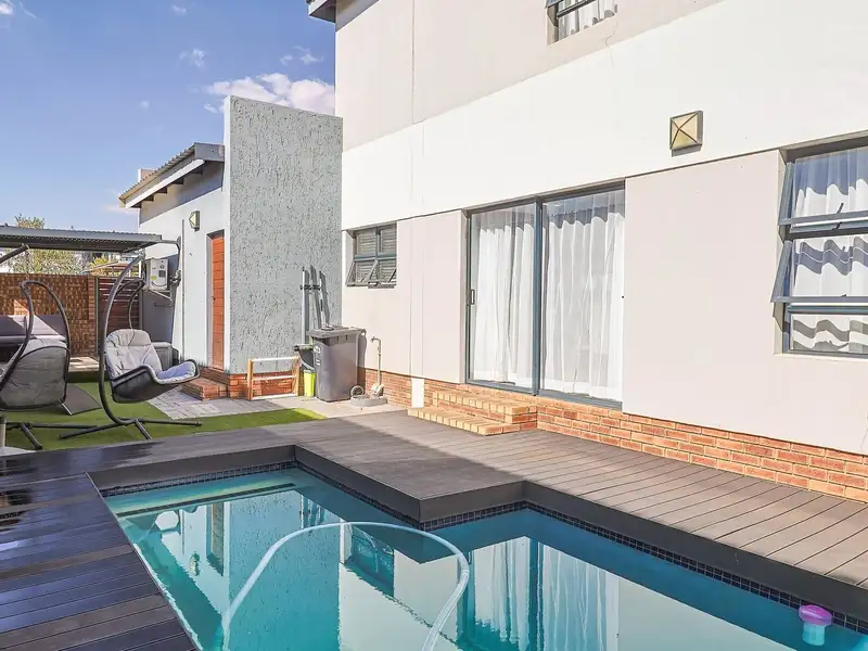 - Sparkling swimming pool with wooden deck