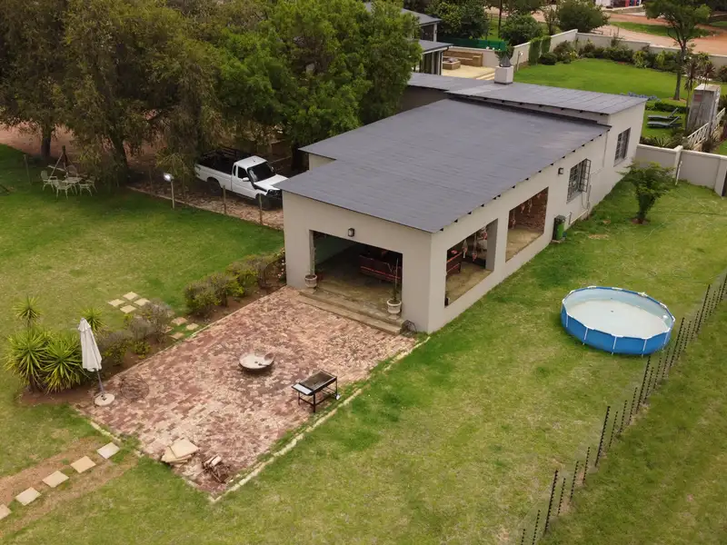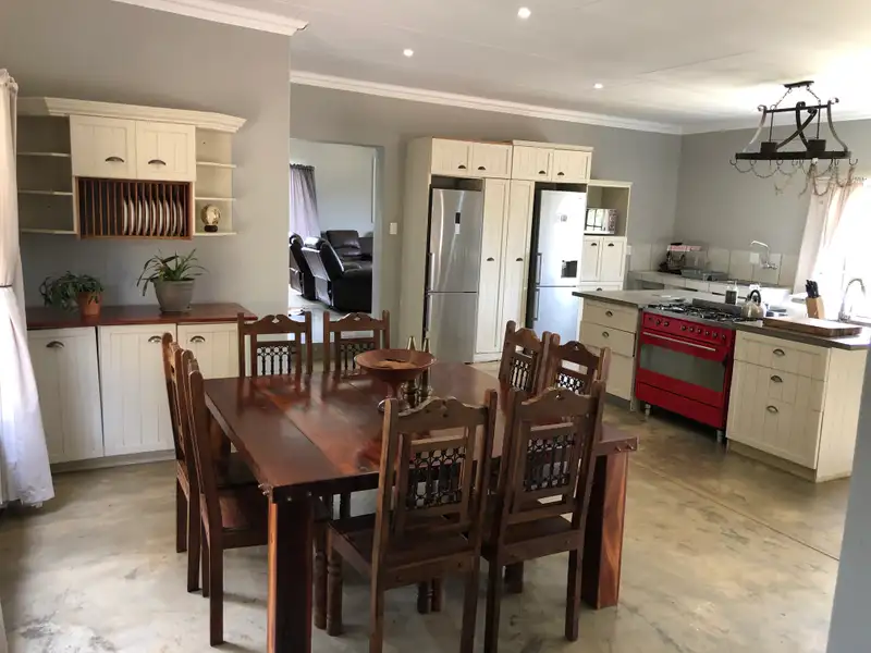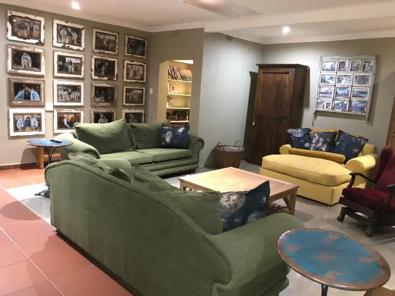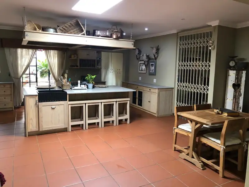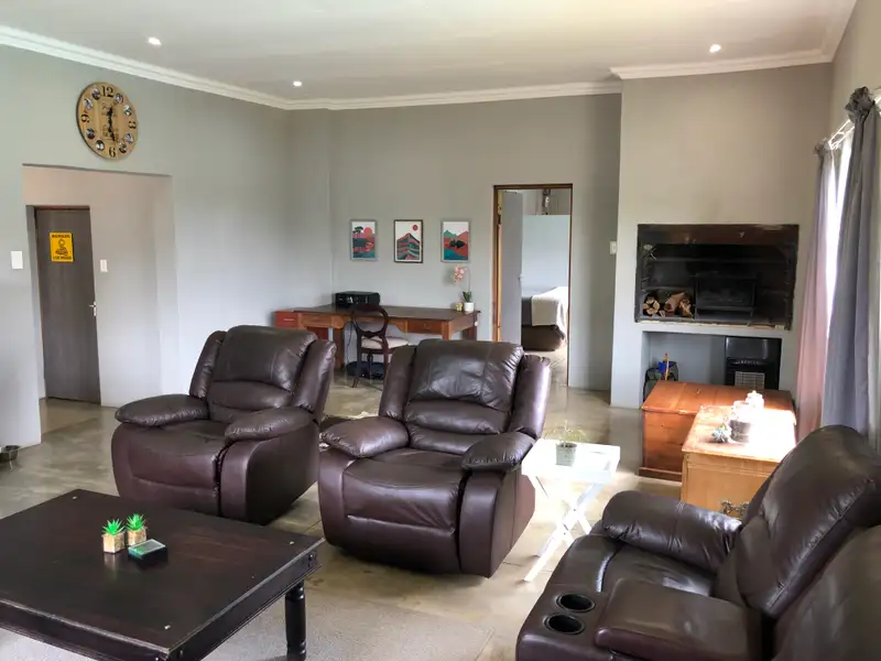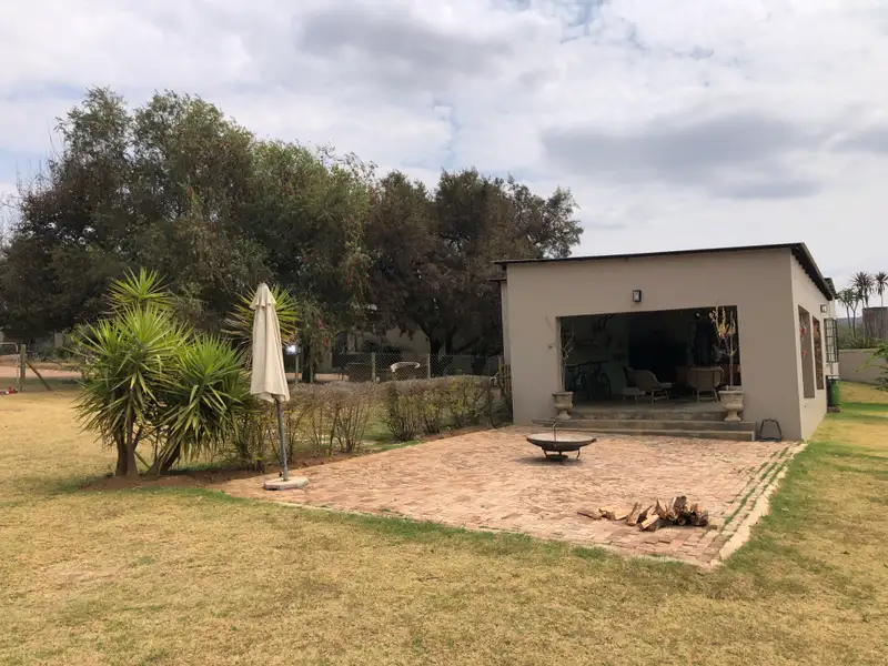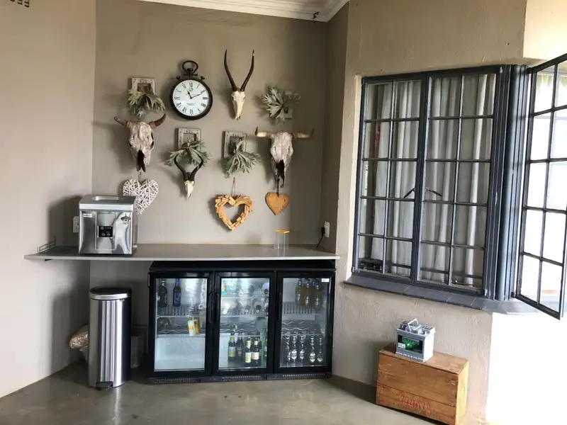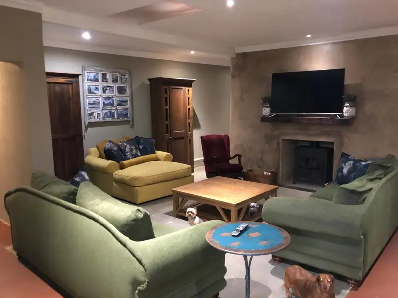 The main house is a true gem, with four spacious en-suite bedrooms and a brand new Smeg gas stove in the newly installed kitchen. The kitchen also features a scullery and pantry, making meal preparation a breeze. With two lounges and an entertainment room overlooking the sparkling swimming pool and fire pit, you can relax in style while enjoying the breathtaking views of grazing Nyala, Blesbok, Springbok, and Ostridge beyond the pool.