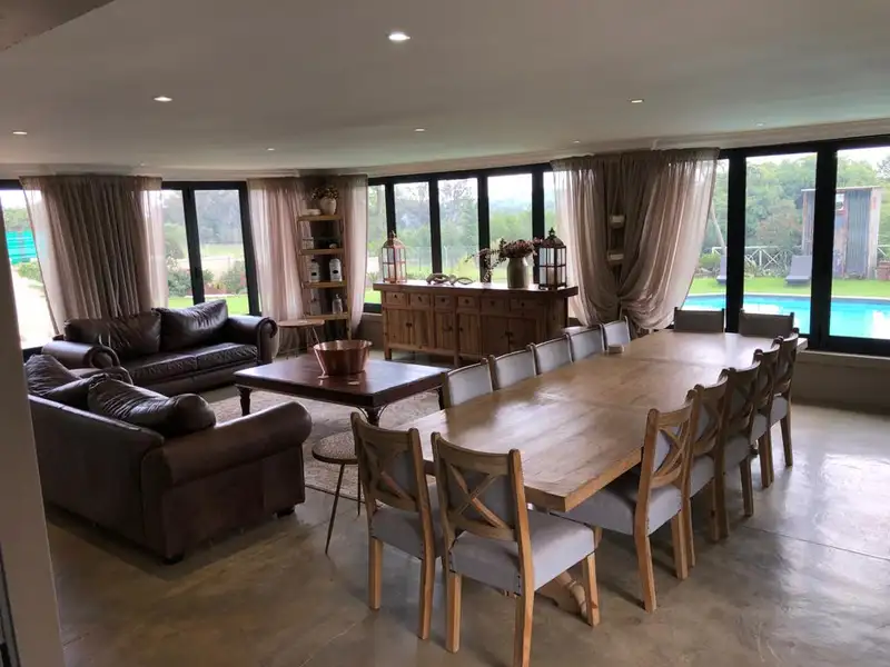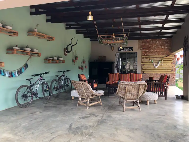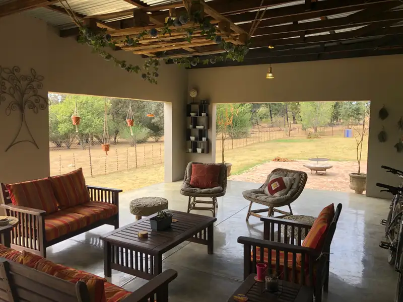 The second house is perfect for guests, with one en-suite bedroom, a cozy lounge, and an open plan kitchen and dining room that leads to a covered patio. From here, you can enjoy the tranquil sight of antelopes grazing in the distance.