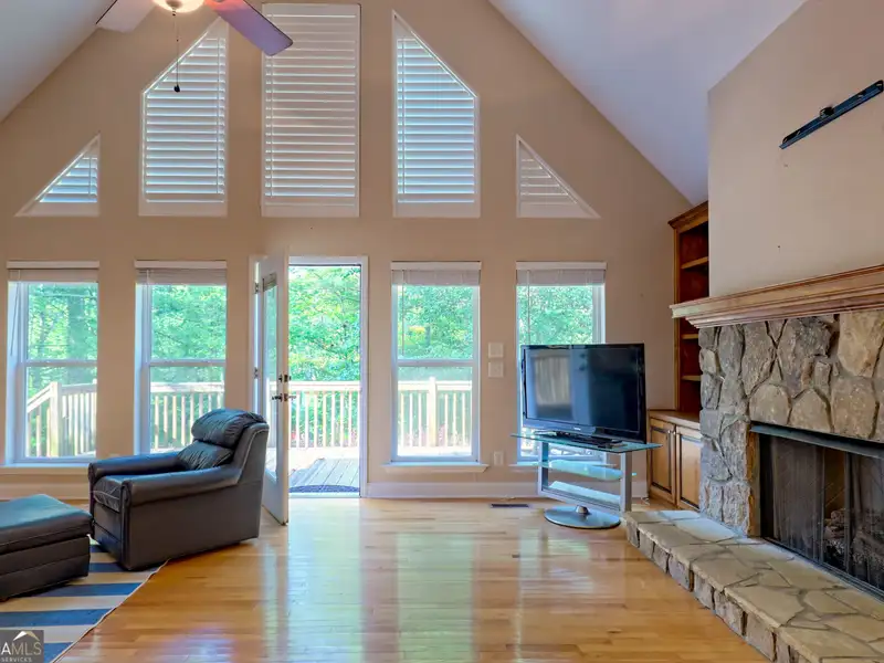 - Stone fireplace with built-in bookcases