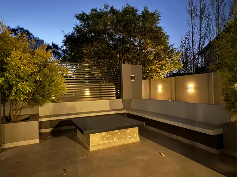 - Outdoor patio with seating and concrete table