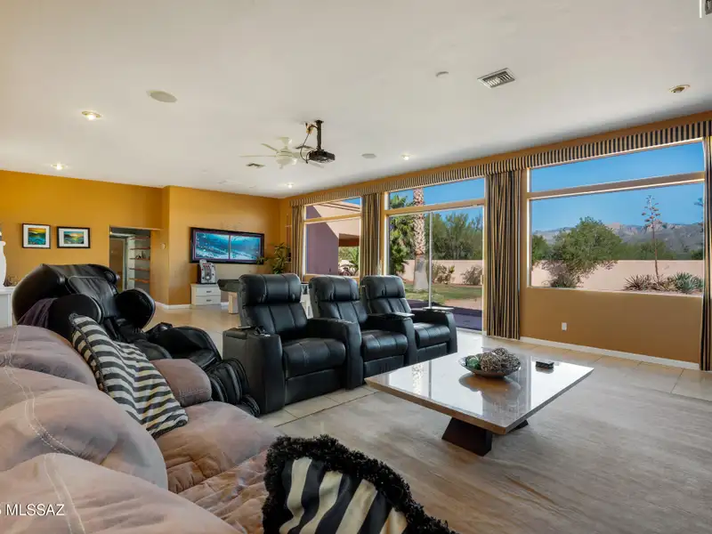 - Home theater with projector and drop-down screen