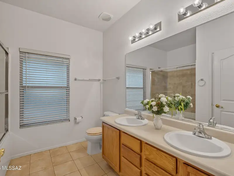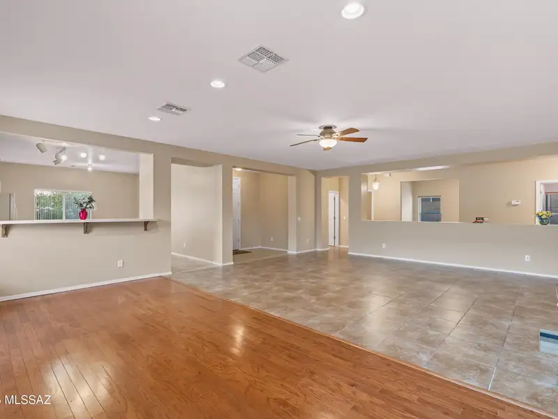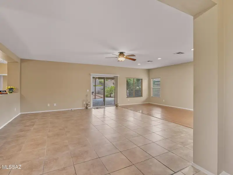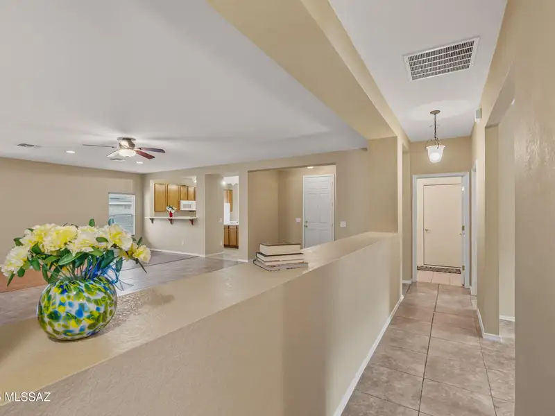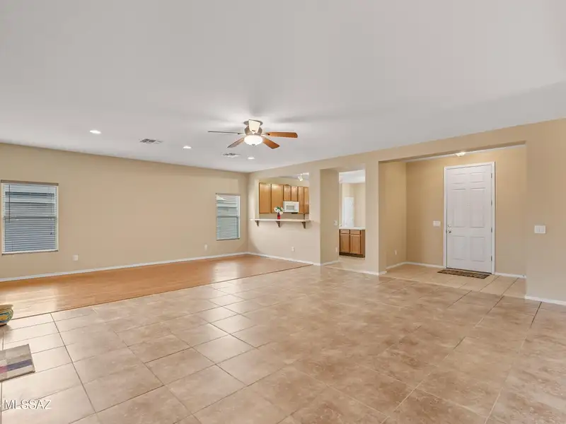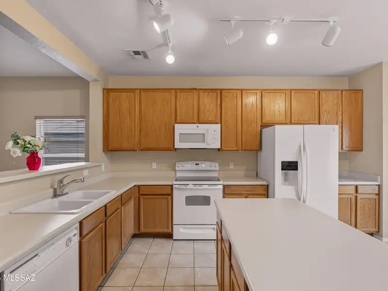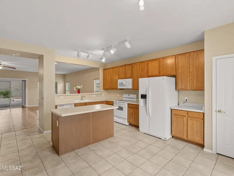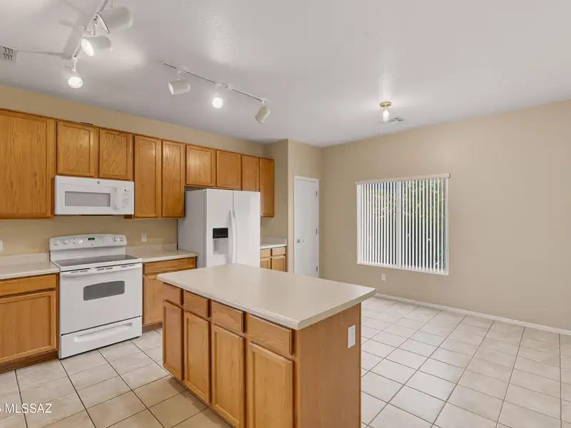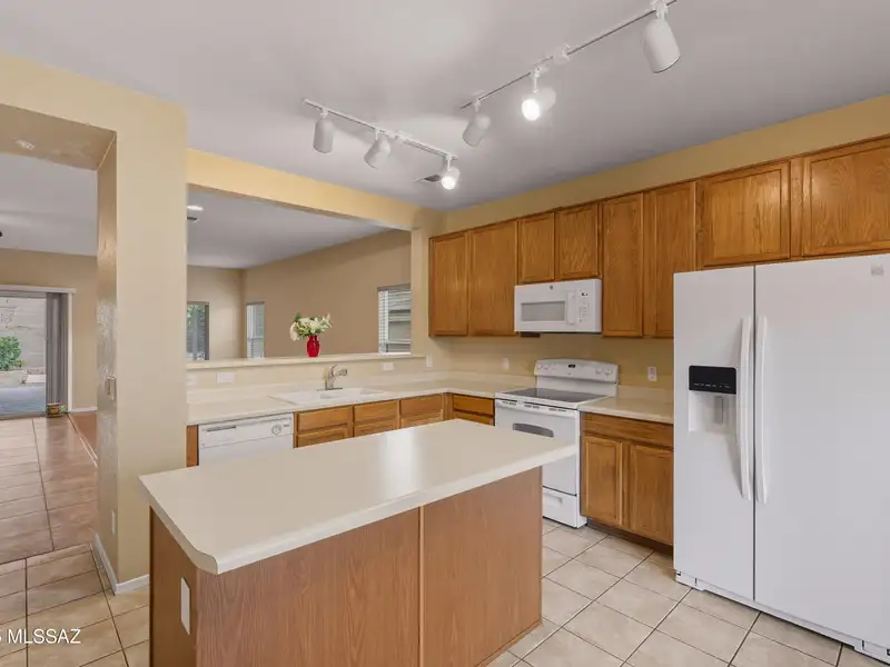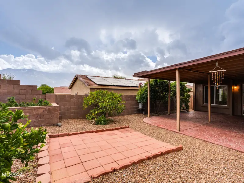 Beautifully cared for, move-in ready single-story home with 3 bedrooms plus a DEN. The open floor plan offers multiple living and dining spaces with tile and laminate flooring throughout—no carpet—and plenty of closets. The spacious kitchen features an island, generous cabinet space, a breakfast bar, a casual dining area, and a formal dining area that flows into the family room. The shower and tub in both bathrooms have been updated with wall-to-wall tile surrounds and sliding glass doors. Outdoors, enjoy a large extended covered patio, several citrus trees, and breathtaking VIEWS of the Catalina Mountains—perfect for outdoor living. Additional features include a finished garage with shelving and a workbench. Conveniently located near shopping, dining, and recreation in Oro Valley.