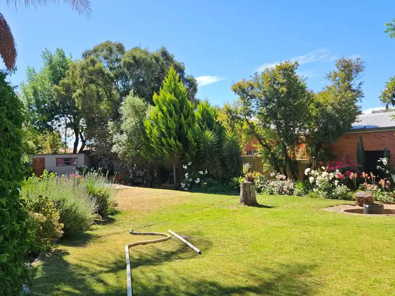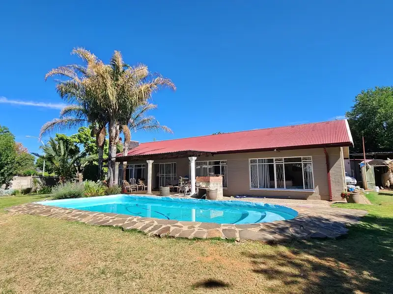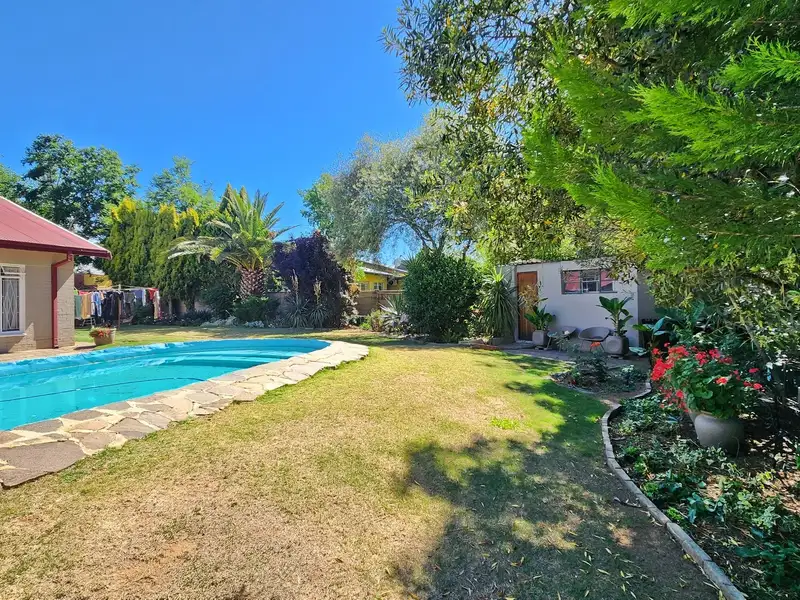- Sparkling swimming pool in lush garden