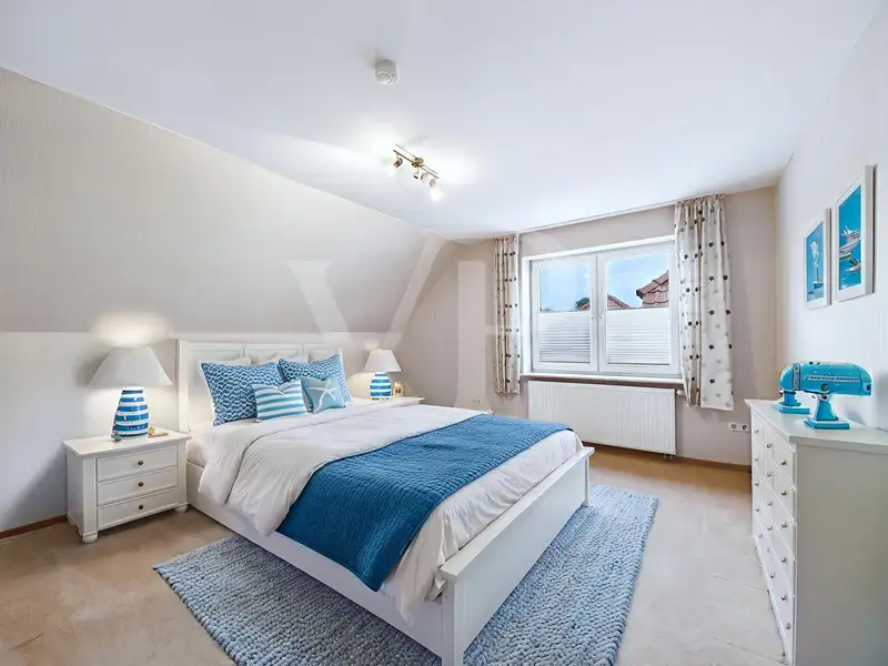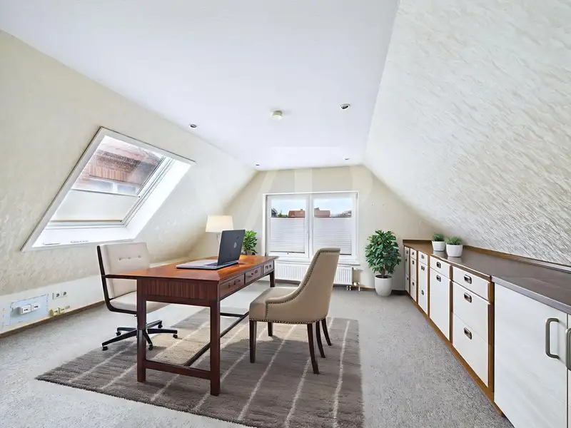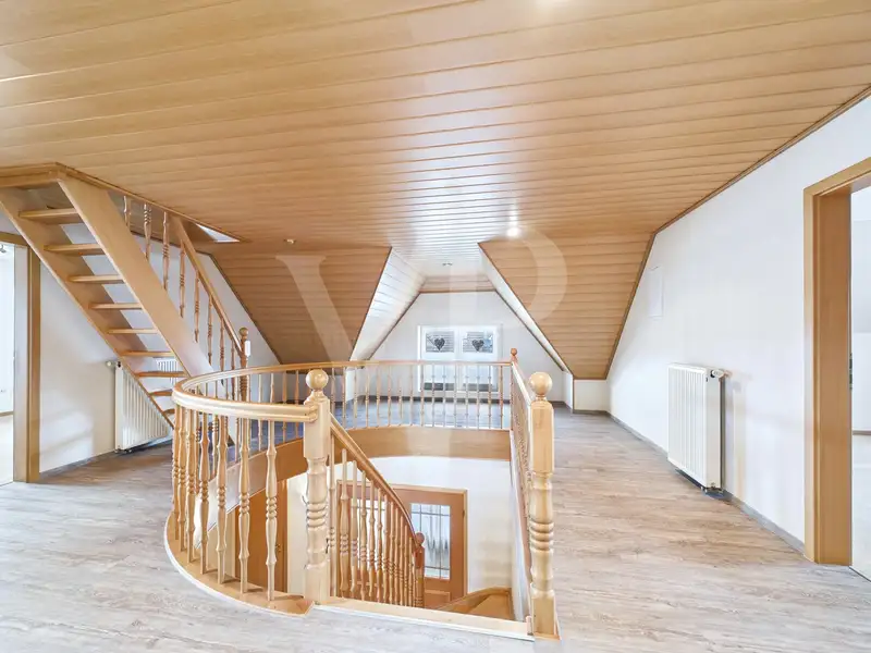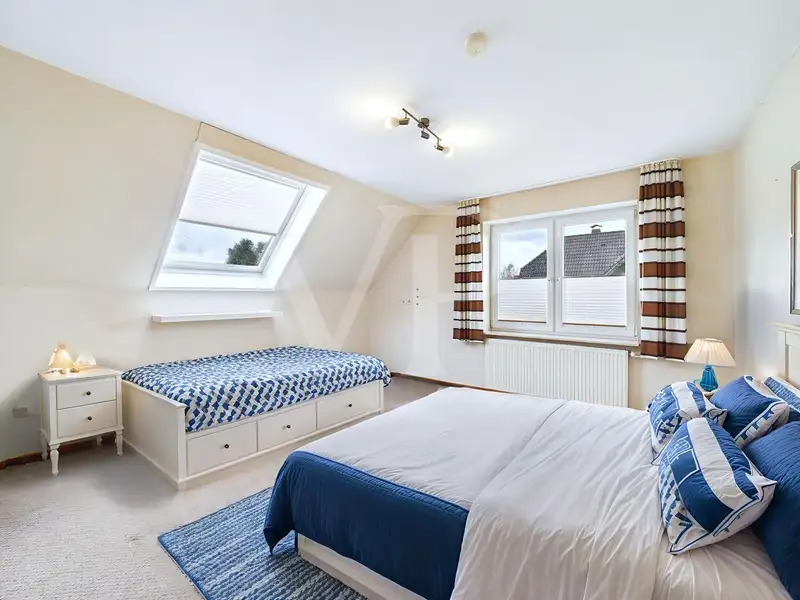 With a total of 9 rooms, including 6 bedrooms and 2 spacious bathrooms with floor-level, wheelchair-accessible showers that were renovated in 2020, the house offers plenty of space for a wide variety of living concepts - ideal for a large family, as a two-generation home or for working and living under one roof. The modern electrical installation (partly renewed), high-quality plastic windows (partly triple-glazed and lockable), solar-powered skylights with rain sensor in the attic and comprehensive exterior blinds underline the high standard of fittings.