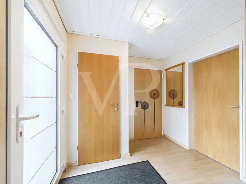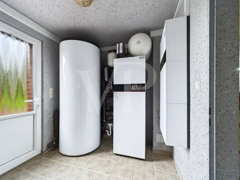 Built in 1998 as a solid construction, the property is in excellent condition following extensive refurbishment. The energy-efficient modernization in 2023 will raise the property to KfW 70 efficiency house standard. This includes the installation of a new, triple-glazed entrance door, the installation of a modern air-to-water heat pump and the addition of two PV systems with a total output of 17.58 kWp and integrated electricity storage. The existing hot water storage tank with a capacity of 400 liters as well as the partial underfloor heating and wall heating guarantee pleasant living comfort at any time of year. The energy concept is complemented by core insulation of the exterior walls and other measures that make the property a low-energy house.