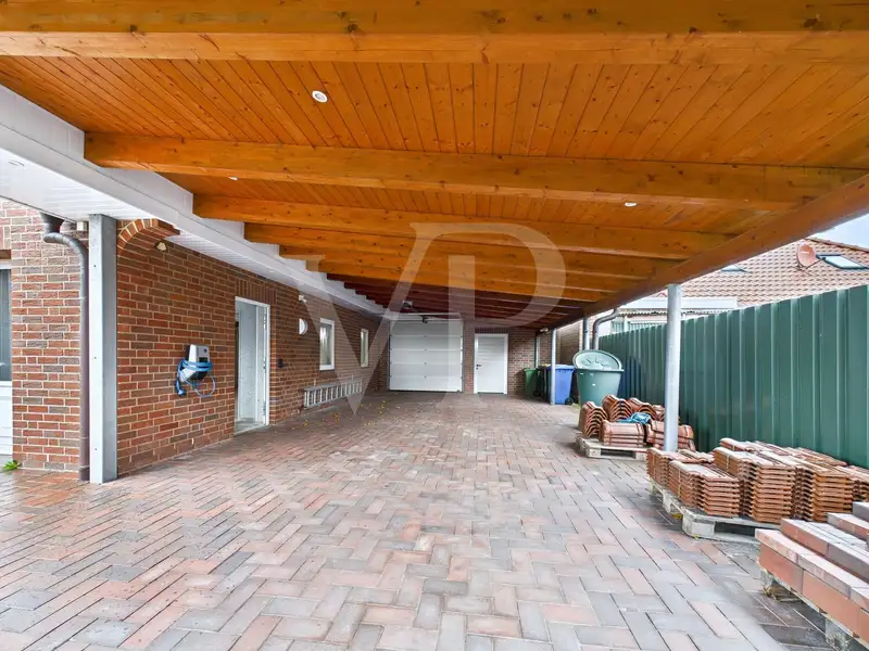 Further features offer a high level of everyday comfort: a fully fenced, sunny south-facing garden, a high-quality wooden garden house (5 x 5 m) and a summer garden extend the living space outdoors on warm days. The spacious carport with integrated ceiling spots is also suitable for a motorhome or boat.
