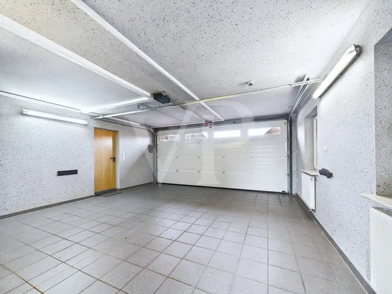 The outbuilding has been extended in many ways: There is a fully-fledged office space above the heated double garage with a 5-meter-wide sectional door and motion detector. A second residential unit can also be realized in the main house. Connections for a kitchen are available in a room on the upper floor. There is also a floor-to-ceiling window that provides access to a small sheltered roof terrace between the two buildings.