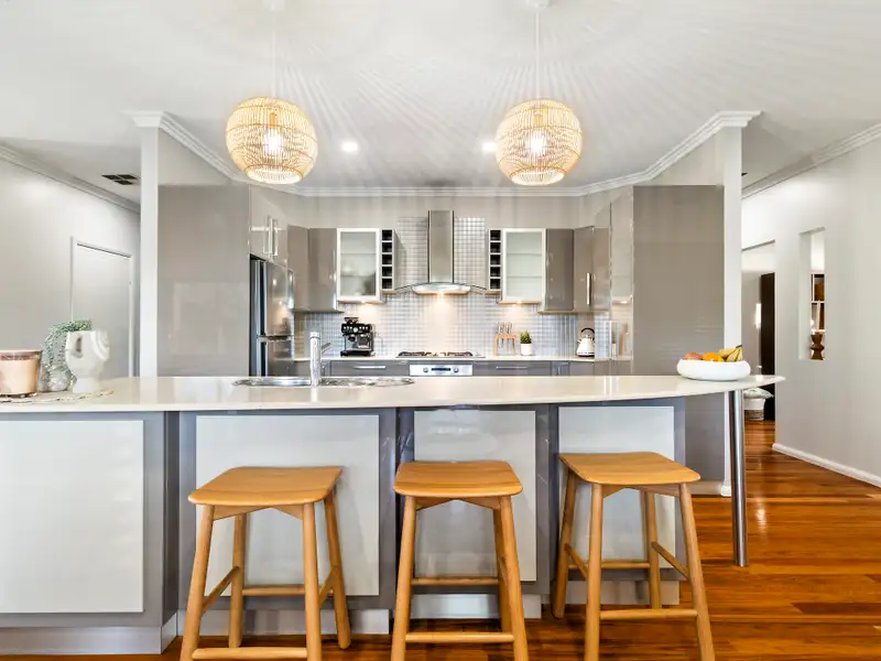 - High gloss kitchen with curved island bench, modern appliances, and an abundance of space