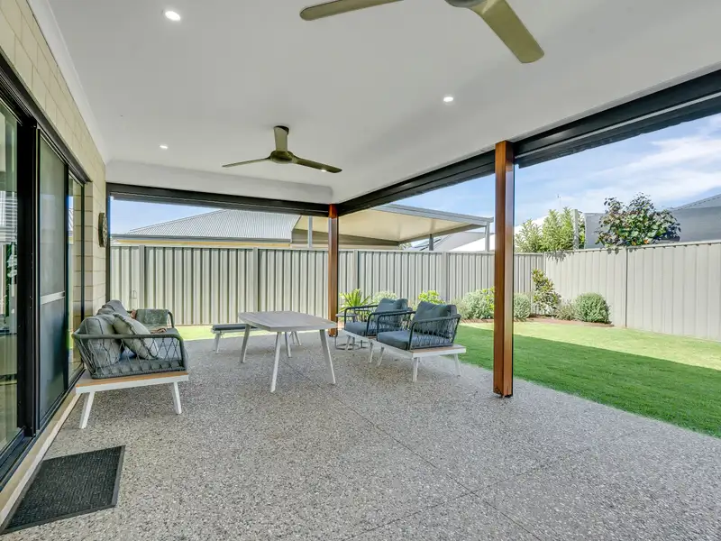 Beyond the main living spaces lies a superb alfresco retreat, designed for all season entertaining. Twin ceiling fans and snap-lock blinds provide ultimate comfort, while aggregate flooring, a built-in bar fridge and a premium outdoor barbecue enhance the space with modern sophistication.