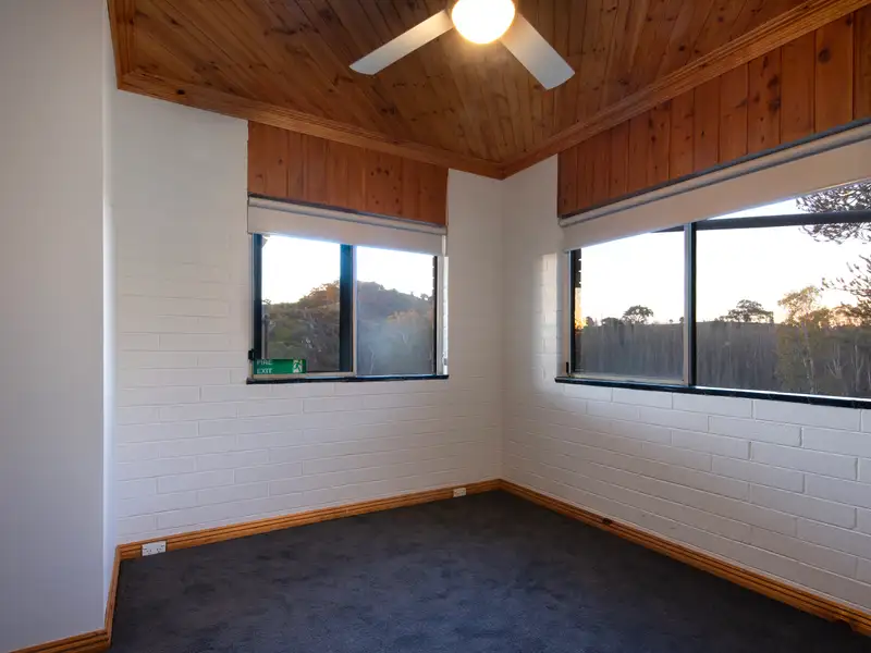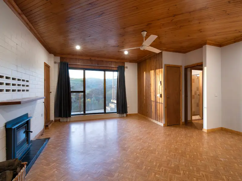 The upper level is the heart of the home, featuring two comfortable bedrooms, one enjoying picture-perfect outlooks over Fryers Creek – a view you'll never tire of waking up to. The main bathroom showcases pure retro love, with quirky original tiling and vanity adding personality and nostalgia. The lounge room and kitchen/meals area are bright and welcoming, flowing to a long breezeway sitting space – perfect for morning coffee or curling up with a book – and a north-facing balcony that takes in the sweeping valley views.