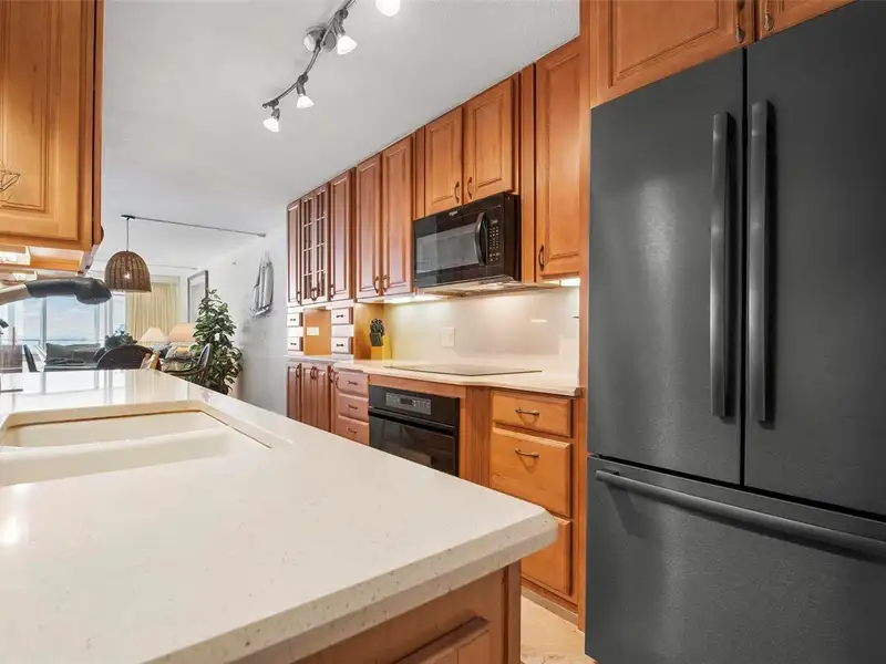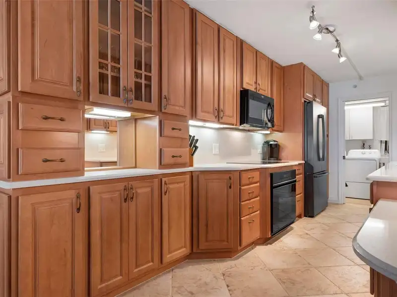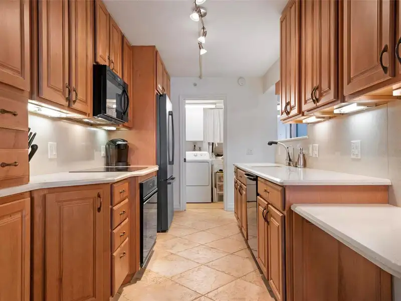 - Hardwood cabinets and sleek stainless-steel appliances