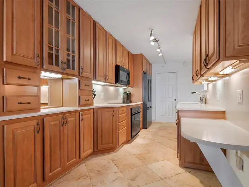 - Modern kitchen with Corian counters and dry bar
