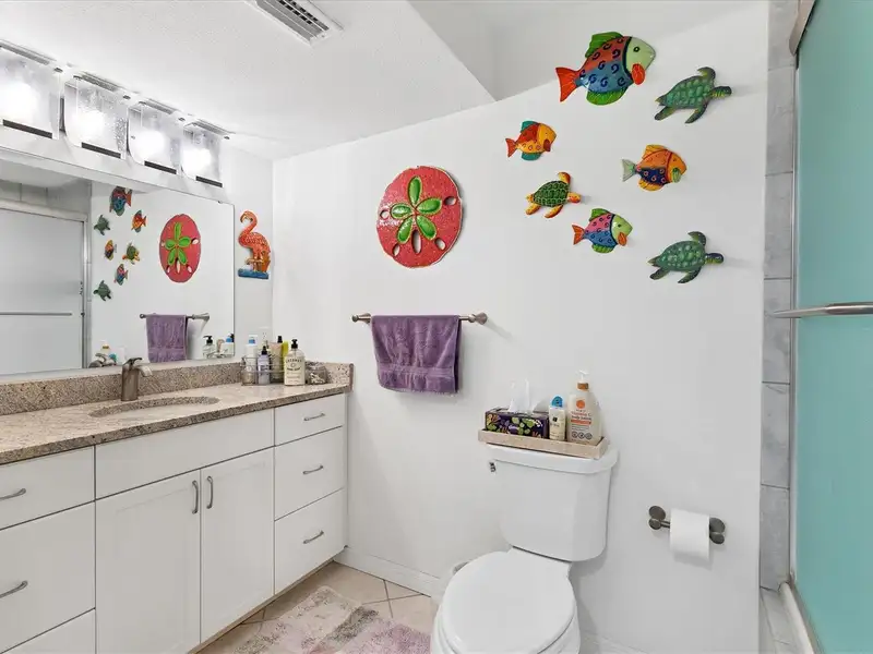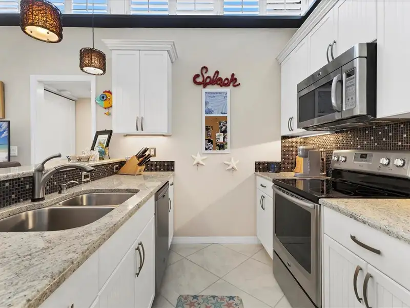 - Stone counters in kitchen and bathrooms