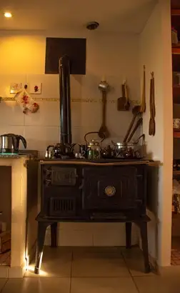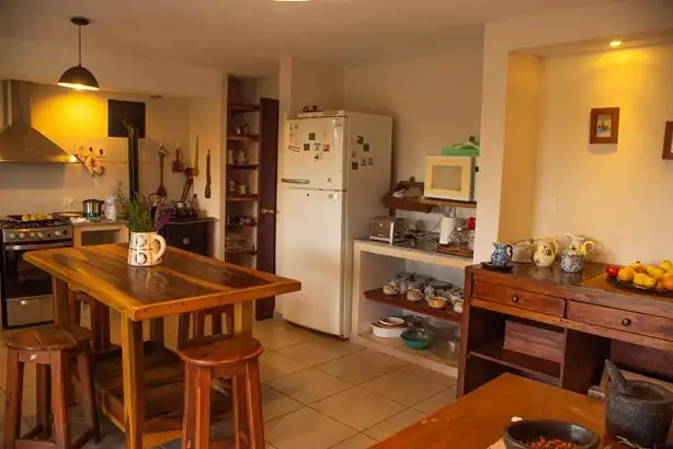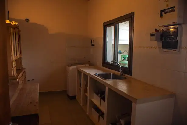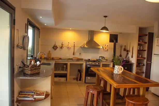 Una gran cocina comedor luminosa, con vista y salida a la galería y al jardín, con mucho espacio para almacenamiento que incluye una hermosa cocina económica. Separado hay un lavadero luminoso, con espacio de guardado en dónde se encuentra la caldera de agua domiciliaria.