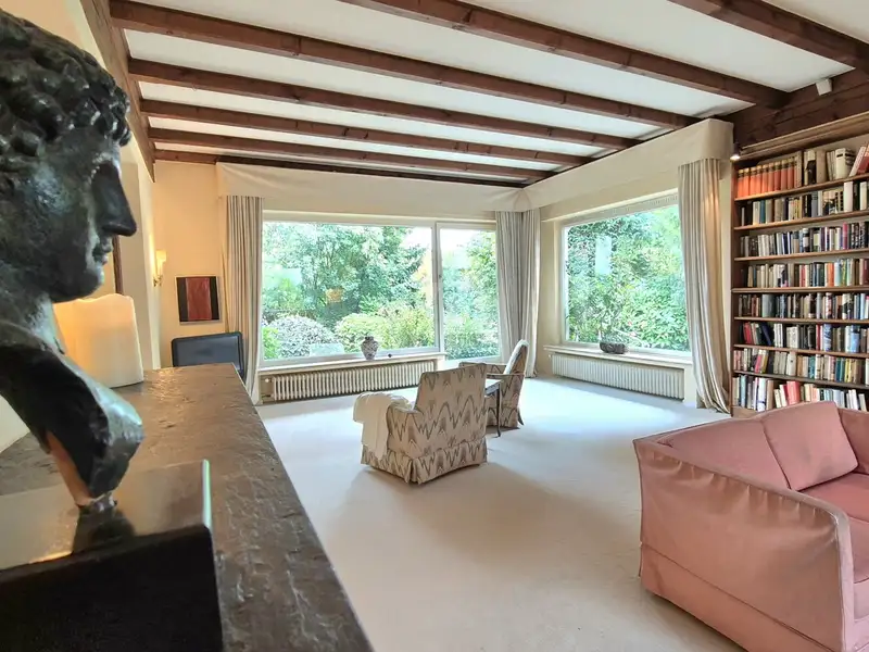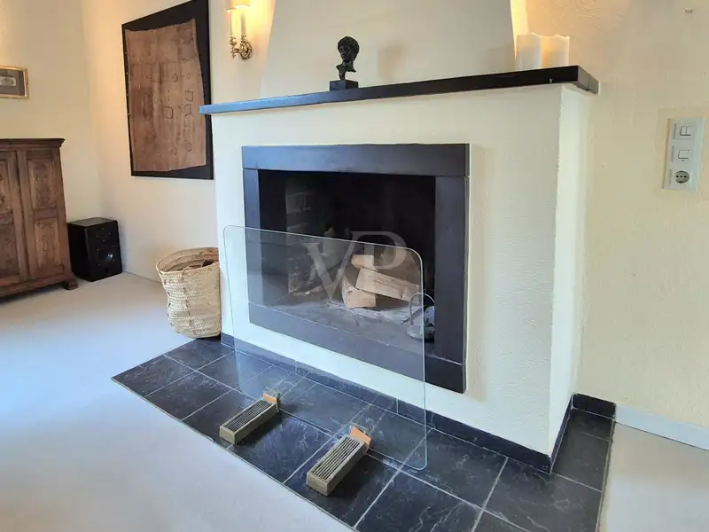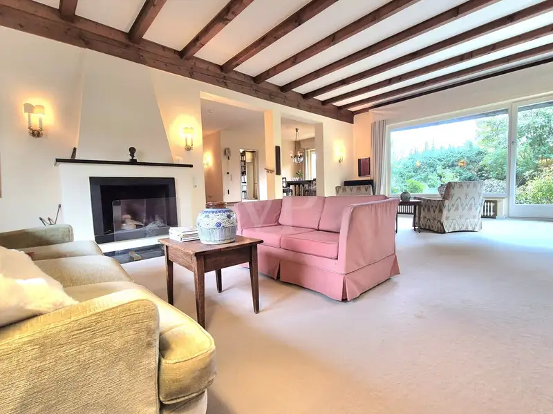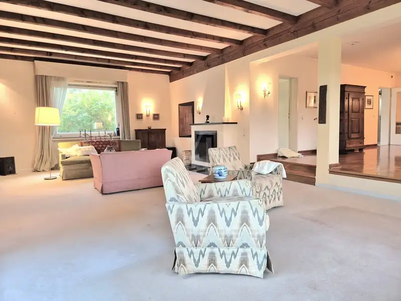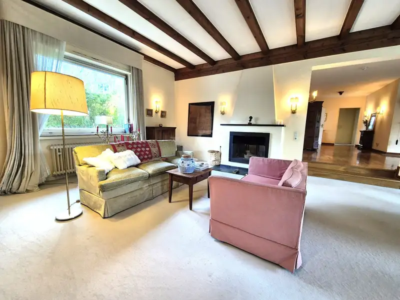 You can feel the special atmosphere as soon as you enter: the heart of the house is the spacious, light-flooded living area on the first floor. Exposed wooden beams and a stylish fireplace give the room a warm, homely feel - perfect for cozy evenings as well as for socializing with family and friends. Large windows open up views of the greenery and allow the interior to shine with natural light - a feeling of space that is a rarity.