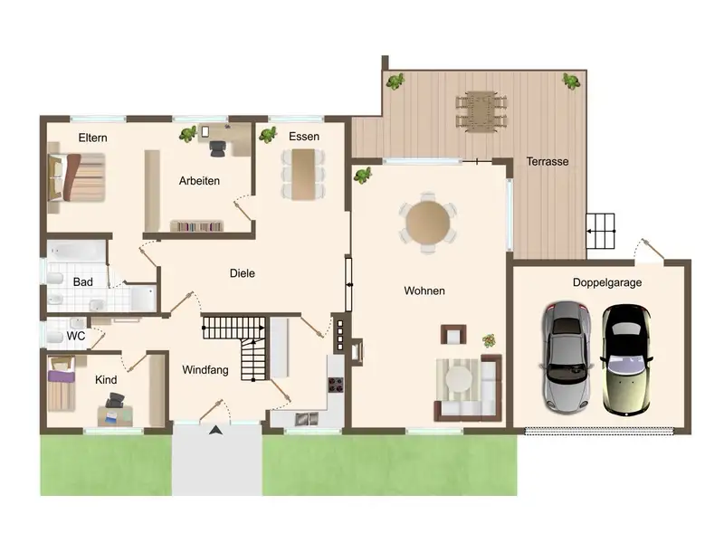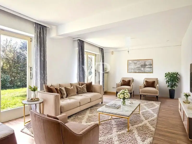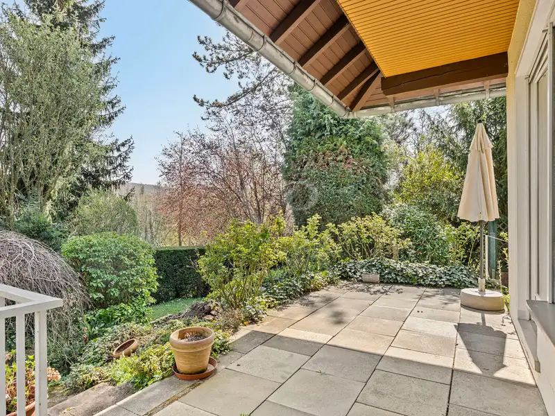 The garden behind the property is barely visible and surrounded by greenery. Various sunny seating areas invite you to relax, enjoy and linger. Whether breakfast on the terrace or a barbecue evening with friends - here you will find pure privacy and nature. The spacious double garage and two additional parking spaces on the driveway round off the offer.