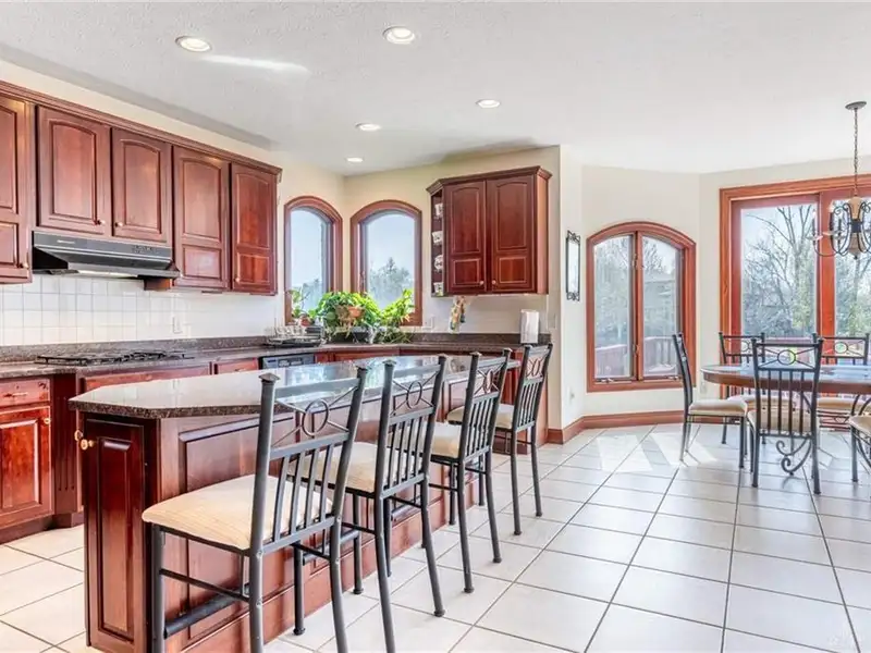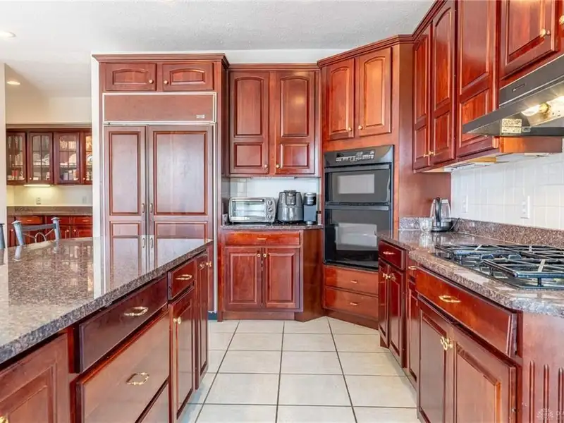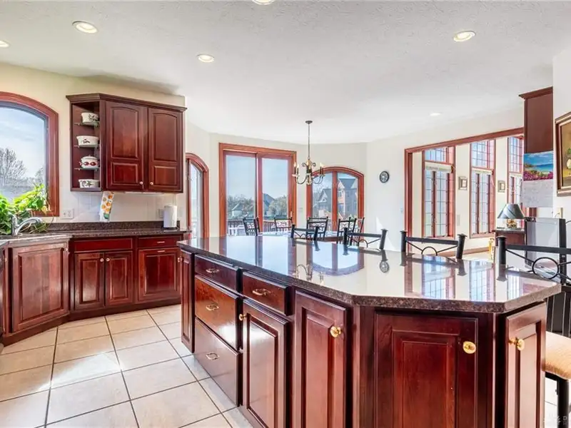 - Large kitchen with granite countertops and island