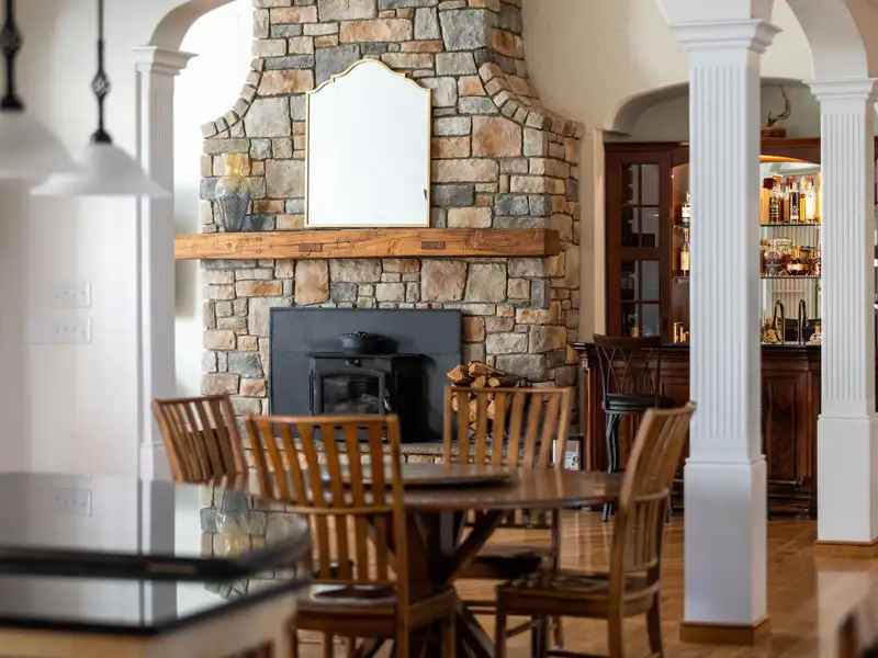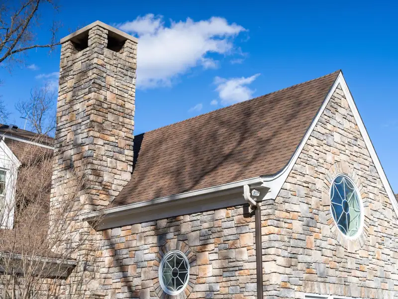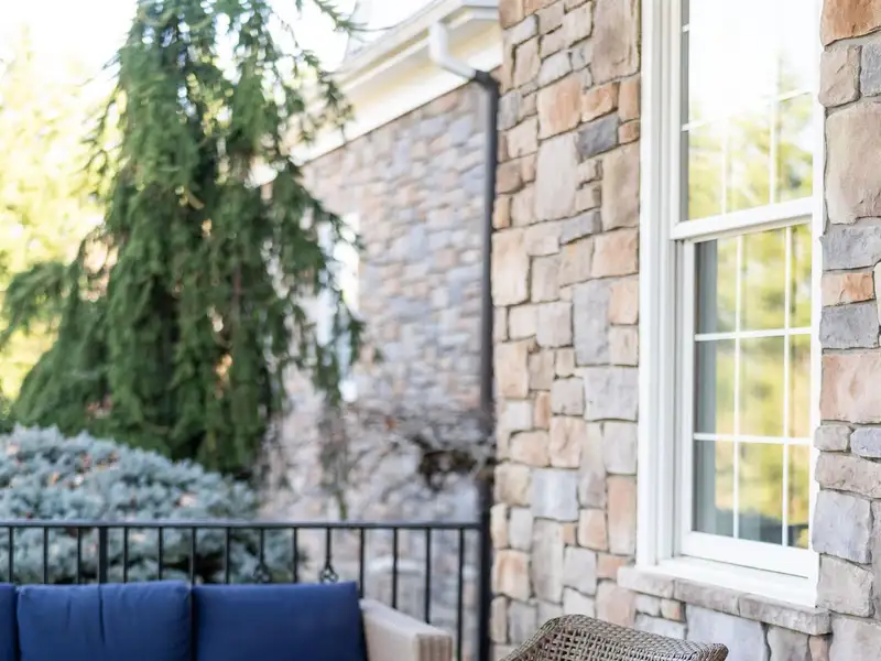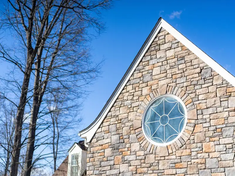 - Stone and slate exterior with iron railings