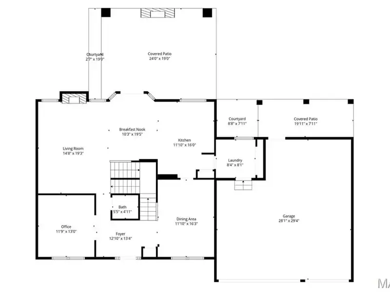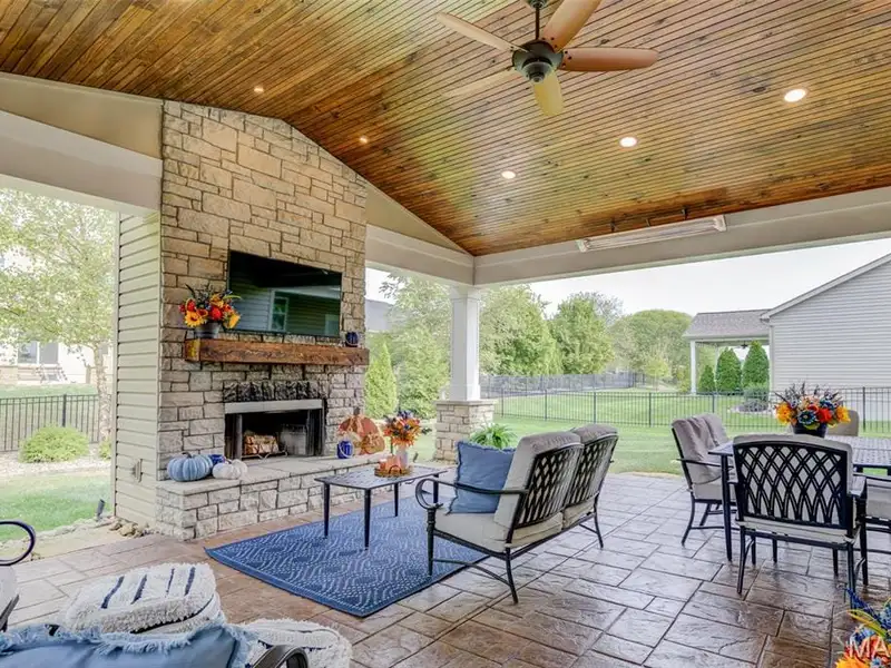 - Large covered patio with stone fireplace
