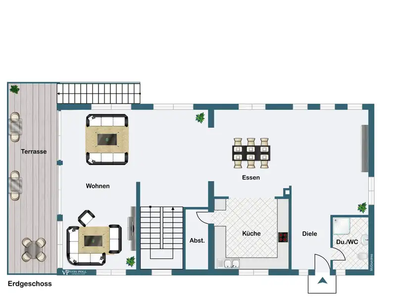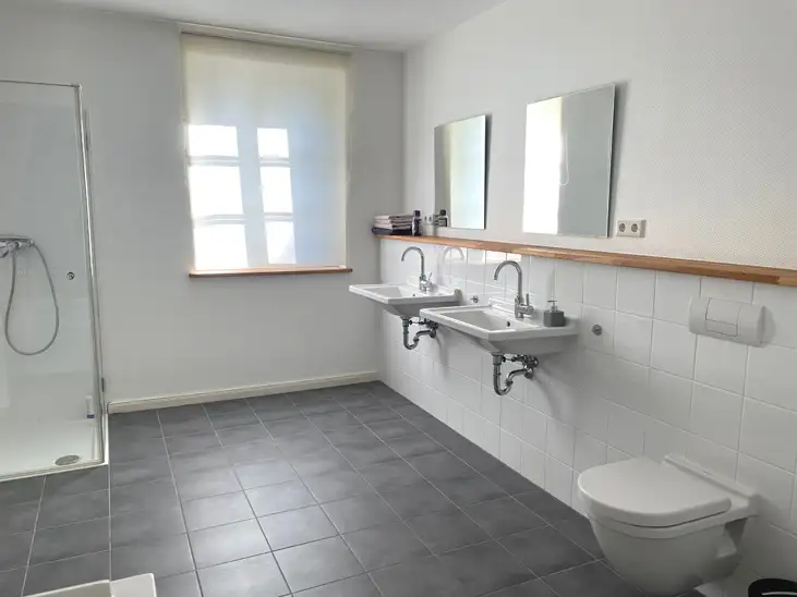 Even the entrance area on the first floor conveys an inviting sense of space thanks to the impressive entrance hall. The open kitchen is practically designed and has a separate storage room. The dining area of approx. 26 m² is generously proportioned and invites you to enjoy meals together. The adjoining living area of approx. 48 m² offers plenty of space for socializing. Generous window areas create a bright and friendly atmosphere and offer a charming view of the extensive garden. A modern bathroom with shower completes the offer on this living level.
