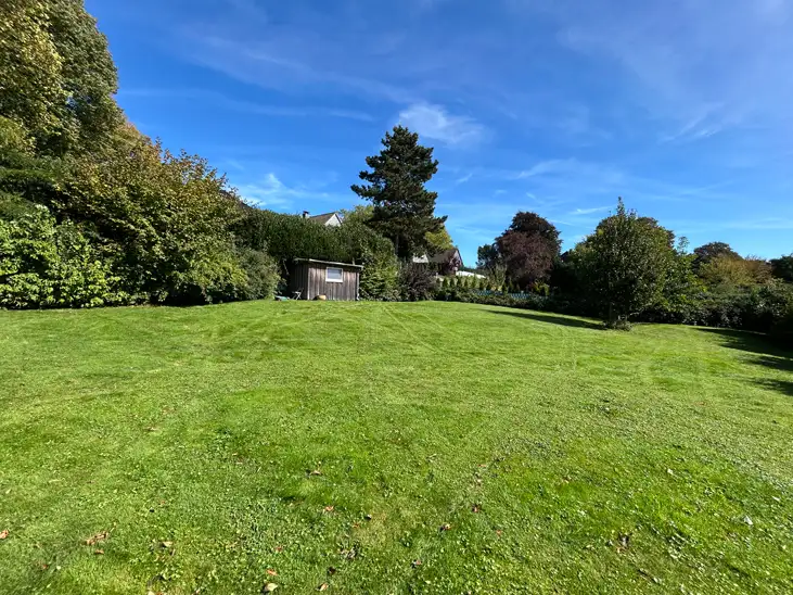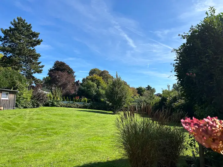 The approx. 1,000 m² garden is invitingly designed and has a large wooden terrace and a garden shed - ideal for relaxing hours in the greenery or social gatherings.