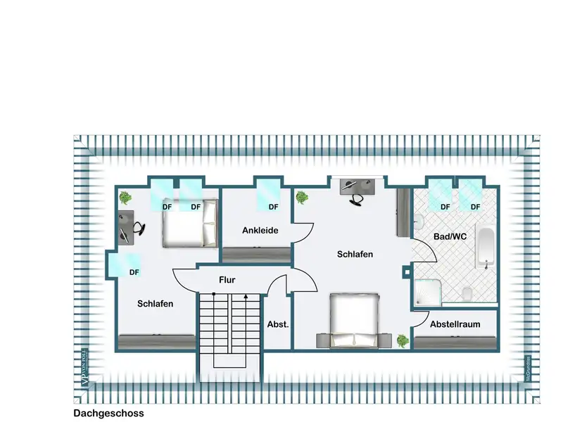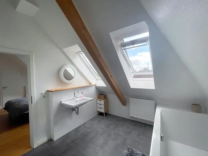 There are two bedrooms on the top floor, one of which has direct access to a bathroom with shower and bathtub as well as a dressing room. Two additional storage rooms offer further storage space.